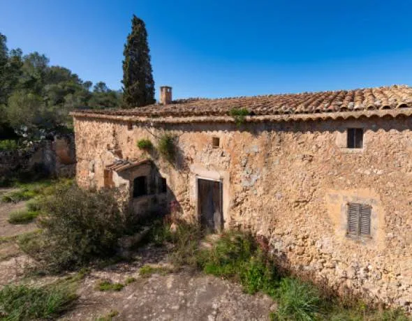 In an elevated position and surrounded by nature, this old farmhouse preserves the essence of traditional Mallorcan architecture. The house, with two floors and old agricultural outbuildings attached, maintains original elements such as the front threshing floor with the remains of a wine press, a cistern dug into the rock and structures linked to its rural past.