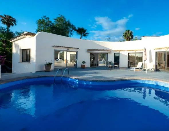 We present this charming Ibiza-style villa, located in a quiet residential area of Marratxí, set on a double plot of 1,180 m² with open views of the Bay of Palma. A unique property that combines authentic Mediterranean character with space, privacy and a layout ideal for family living.