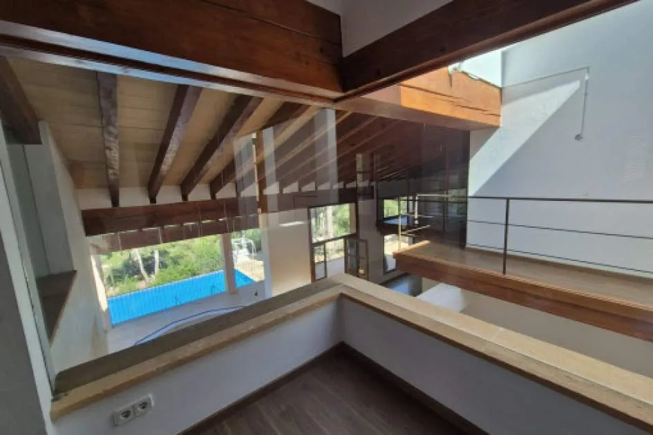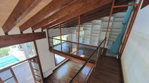 Details: This spacious villa is located in Ses Rotgetes, a quiet residential area close to Esporles, surrounded by a picturesque, mountainous landscape. The hillside plot measures approx. 3,000 sqm and features a private driveway, a well-maintained garden, and a large pool area. The property offers approx. 480 sqm of living space and is designed in an open-plan loft style with large windows and abundant natural light. The ground floor includes a spacious living and dining area with panoramic views and a fully equipped kitchen. There are also 2 bedrooms and 3 bathrooms on this level. A spiral staircase leads to a gallery level with an open-plan library room and fireplace, which can also serve as an office. The master bedroom is located on the upper floor and includes a walk-in dressing room and a generous bathroom with a whirlpool bathtub. The large, covered terrace in front of the house offers plenty of space and impressive views over the surrounding countryside and towards Palma. The property also features a very large garage located on the lower level of the hillside structure. The villa is available for a 12-month rental. Utilities such as electricity, water, and heating oil for the central heating system are charged separately. Location & surrounding area: Esporles is situated in the mountains of the Tramuntana and has about 4.000 inhabitants, not far away from Palma, Valldemosa and Banyalbufar on the west coast. In earlier times the textile industry was an important element of the economy, today it is more agriculture and stock-farming and of course tourism. A walk through the village is always worthwhile.
