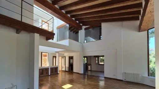Details: This spacious villa is located in Ses Rotgetes, a quiet residential area near Esporles, surrounded by idyllic mountain scenery. The sloping plot is approx. 3.000 sqm and includes a private driveway, a well-kept garden and a large pool area. The property offers ample living space and is designed in loft style, with large windows and plenty of natural light. On the first floor there is a spacious living-dining room with panoramic views and a fully equipped kitchen. There are also 2 bedrooms and 3 bathrooms, 2 of them en suite, on this floor. A spiral staircase leads to the upper floor, where there is an open gallery with a library with fireplace that can also be used as an office. The master bedroom has a dressing room and a large bathroom with whirlpool tub. The covered terrace in front of the house is very spacious and offers stunning views of the natural surroundings. The property also has a large garage on the lower level of the house. Returns from holiday lettings: For initial orientation you can use the “Porta Holiday Returns Calculator” without obligation to calculate your potential returns from holiday letting. NB: Due to the current legal situation it is possible that in certain municipalities renting restrictions may apply, or new touristic licences may not be granted. Your Porta Mallorquina real estate consultant will be pleased to advise you whether the property you have chosen is affected. Go to Returns Calculator. Location & surrounding area: Esporles is situated in the mountains of the Tramuntana and has about 4.000 inhabitants, not far away from Palma, Valldemosa and Banyalbufar on the west coast. In earlier times the textile industry was an important element of the economy, today it is more agriculture and stock-farming and of course tourism. A walk through the village is always worthwhile.