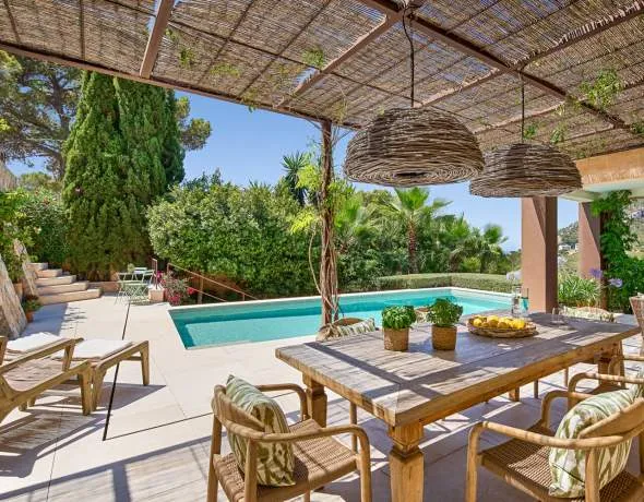 This south-west-facing villa is situated on a plot of 1,430 m² in the enchanting hilly landscape above the ‘Club de Vela’ marina. Its elevated position on the south side of Port Andratx harbour offers beautiful sea and panoramic views. This exquisite, country-style villa is located in one of the most sought-after areas of the picturesque town of Port Andratx. The neighbourhood captivates with its fascinating combination of natural beauty and an exclusive lifestyle. Port Andratx is renowned for its charming harbour, luxurious yachts, and an array of first-class restaurants where you can relax and unwind.