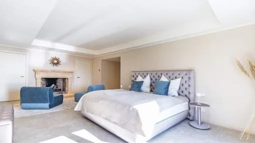 Details: With beautiful beaches, clear water, and a variety of recreational opportunities, this impressive villa is located in the idyllic coastal area of Costa de la Calma. From the very first step through the stunning entrance, you are transported into a world of luxury and elegance. Upon entering, you are greeted by a breathtaking panoramic view of the endless expanse of the sparkling sea. The large windows allow light to flood in, creating a harmonious connection between the indoor and outdoor areas. The spacious living areas are equipped with high-quality materials and stylish accents, providing the perfect setting for unforgettable moments. The open floor plan allows for a seamless flow between the different areas, while the luxurious furnishings and tasteful decor guarantee the highest level of comfort. The villa features 5 elegant bedrooms, each with its own bathroom, a custom American kitchen with an adjoining open living room, a sauna and fitness area with a bathroom and cold plunge pool, a guest toilet, a laundry room, numerous storage rooms, and a double garage. The outdoor area is a true paradise with a saltwater pool and a generous lounge area that invites relaxation and enjoyment. Here, you experience not just a home, but a lifestyle characterized by beauty, tranquility, and unforgettable views. This villa is the epitome of luxury and offers you the opportunity to spend every day in a dreamlike setting. Returns from holiday lettings: For initial orientation you can use the “Porta Holiday Returns Calculator” without obligation to calculate your potential returns from holiday letting. NB: Due to the current legal situation it is possible that in certain municipalities renting restrictions may apply, or new touristic licences may not be granted. Your Porta Mallorquina real estate consultant will be pleased to advise you whether the property you have chosen is affected. Go to Returns Calculator. Location & surrounding area: Costa de la Calma is a very quiet residential area of great beauty between Santa Ponça and Peguera. On its coastline is the Cala Blanca beach which is characteristically rocky and has several entrances into the sea, as well as the small stony bays.