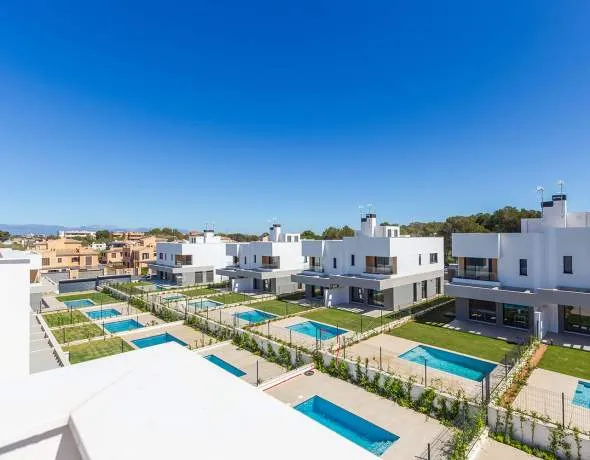 This project of the highest quality, consisting of 16 exclusive semi-detached villas (5 still available), is situated in a quiet residential area in the village of Puig de Ros, just a 15-minute drive from Palma and the airport. The Maioris golf course, the spectacular cliffs with secluded coves, the luxurious Mhares Sea Club with relaxation area, pool and gastronomy as well as a shopping centre with various restaurants are all within easy reach. The imposing villas have three bedrooms (plus a multi-purpose room) and three bathrooms, spread over two levels. In addition, they have a large garden, a private saltwater pool and two parking spaces. All the houses in the complex are almost identical and boast first-class fixtures and fittings and a spacious, open-plan layout. Large, floor-to-ceiling windows flood the rooms with natural light and create a bright, inviting atmosphere. The project developer opted for a sustainable construction concept that not only promotes environmental protection but also contributes to lower energy and operating costs.
