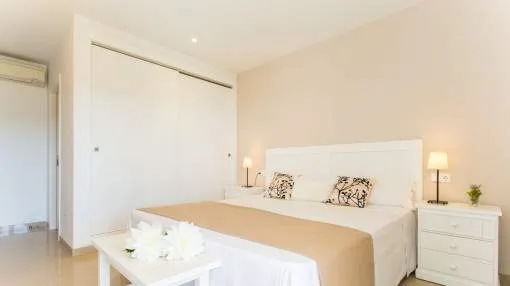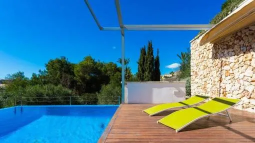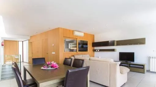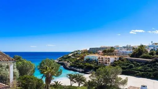 Details: A dream location: situated next to Cala Mandia with its fine sandy beach and close to Porto Cristo, this elegant house has its own pool and fantastic sea views. The living area of approx.140 sqm is distributed optimally over three floors. The living room is spacious and modernly equipped with an adjoining wide, covered terrace from which marvellous views of the Mediterranean Sea can be enjoyed and there are 3 bedrooms with bathrooms. The house has been very tastefully designed and furnished. The plot with landscaped garden is structured in terraces and includes a private pool of 4 x 6 m. A road at the side of the house leads to the fine sandy bay of the charming Cala Mandia and the house also has its own convenient parking area. Location & surrounding area: The bay and the village Cala Mandía are situated on the east coast of Mallorca, just below Porto Cristo and belongs to the municipality of Manacor.