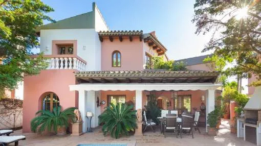 Details: This impressive villa stands on a plot of approx. 2700 sqm and is surrounded by a lovingly landscaped garden park with a number of comfortable lounges and a large pool area. There is also a small putting green as a highlight for golfers. The fully-equipped summer kitchen with barbecue grill and an outdoor, Carribean-style bar can be enjoyed both in the summer and winter months due to the closable outer walls. There is also an inviting chill-out pavilion with ample seating and reclining areas for relaxing or celebrations. The approx. 450 sqm living space of the villa is distributed over 2 spacious floors and a cellar. On the ground floor is a modern open kitchen, fully equipped with all necessary appliances, a guest WC, the bright dining area with direct access to the terrace and pool, and the comfortable, light-flooded living room The 1st floor consists of the spacious master bedroom with spa-bathroom and 2 additional bedrooms, all en suite. All bedrooms have access to the magnificent terrace with unrestricted views of the garden and the sea. On the ground floor is a sauna with shower, a completely equipped fitness room, a very spacious Jacuzzi with counter current system, a multi-purpose cellar room and the garage. The villa is in an excellent structural condition and its specification includes centralised air conditioning for summer and winter, central heating and double glazed windows and doors. Truly a dream property on the sea which leaves nothing to be desired. Returns from holiday lettings: For initial orientation you can use the “Porta Holiday Returns Calculator” without obligation to calculate your potential returns from holiday letting. NB: Due to the current legal situation it is possible that in certain municipalities renting restrictions may apply, or new touristic licences may not be granted. Your Porta Mallorquina real estate consultant will be pleased to advise you whether the property you have chosen is affected. Go to Returns Calculator. Location & surrounding area: Vallgornera belongs to the county of Llucmayor and is situated between Cala Pi and S´Estanyol. This new urbanisation was constructed for everyone who wants to have calm and privacy. There only a few construction activities. The new buildings are fitted in the landscape. The steep coast of Vallgornera possess a fantastic view to the sea and orientation south so that the sun is guarenteed for all the day. In the coves there are possibilities for swimming. One of the main attraction of the region is the sand beach of Es Trenc. It is one of the longest one and the only natural sand beach on Majorca.
