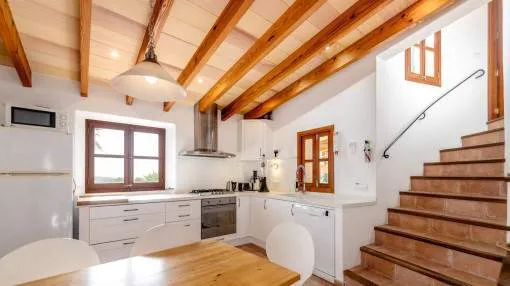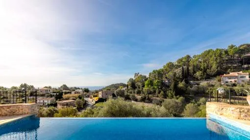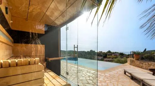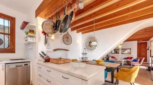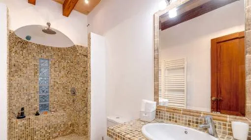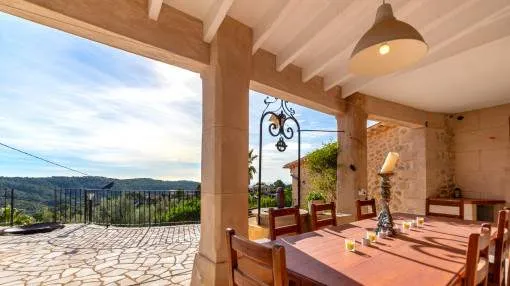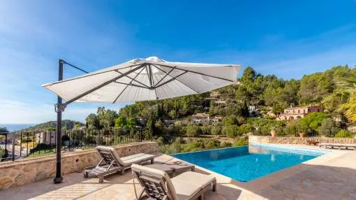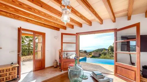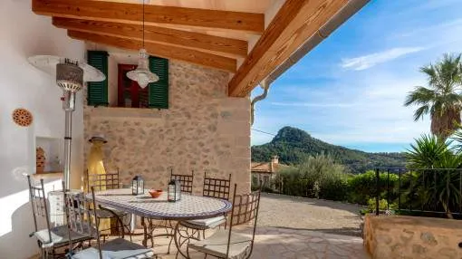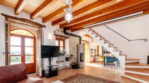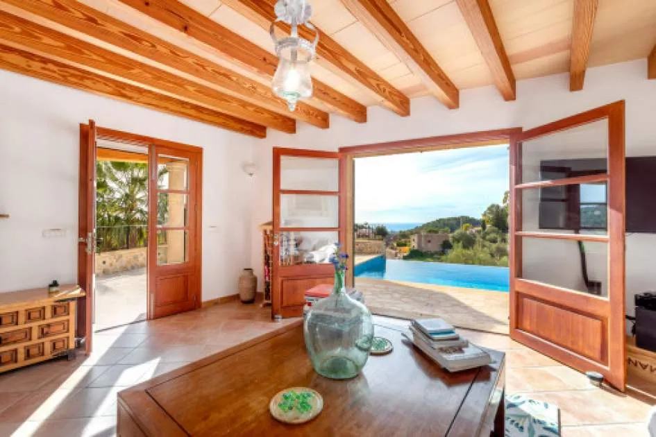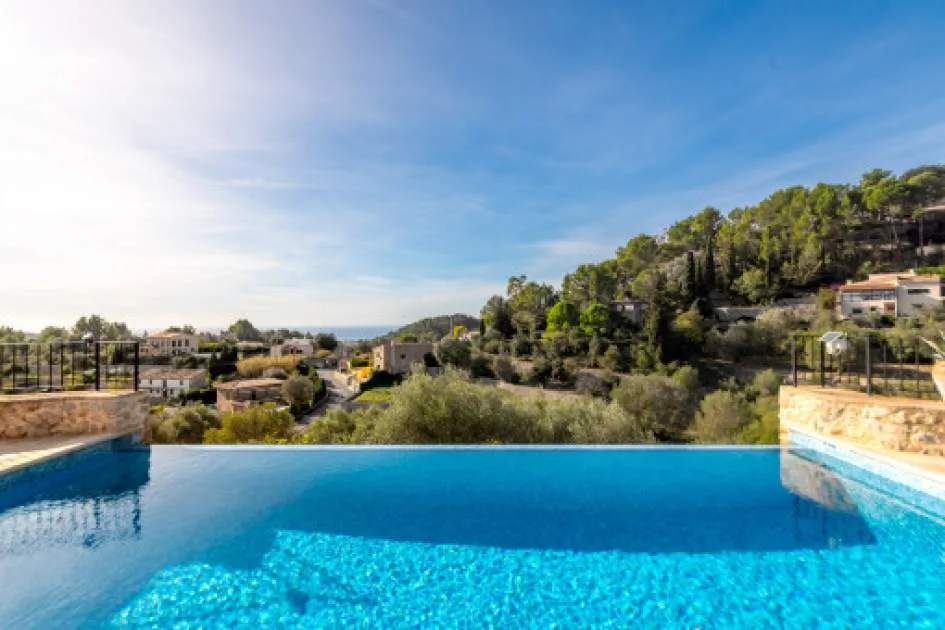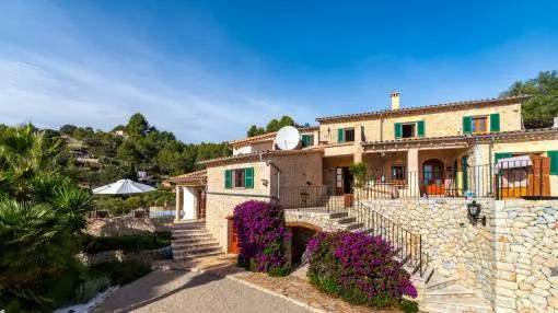 Details: Available from June 2026 This charming residence is located in the idyllic mountain village of Galilea, in the heart of the Tramuntana Mountains. The setting offers absolute peace and nature, while Palma is reachable in about 30 minutes and Santa Ponsa in around 20 minutes. The nearby villages of Puigpunyent and Es Capdellà offer a variety of excellent restaurants, making this the perfect combination of tranquillity and convenience. The historic finca, originally built in 1750, has been completely refurbished and now blends traditional charm with modern comfort. The house extends over two floors and can be used either as one residence or as two independent units. It offers five bedrooms and five bathrooms, two spacious living rooms—each with a fireplace—and two fully equipped kitchens. A true highlight is the heated saltwater infinity pool with sea views reaching as far as Santa Ponsa. The sauna, with its panoramic views over the surrounding landscape, provides the perfect place to unwind. The expansive plot includes an orchard, olive trees, and a barbecue area with a pizza oven. Additional features include underfloor heating, air conditioning, a solar energy system, an electric car charging point, and a large carport for multiple vehicles. High-speed fiber-optic internet is available. Seasonal Rental Conditions The property is available for rental both in summer and winter. The monthly rental price ranges between €8,000 and €15,000, depending on the season and duration of the stay. Included in the price: – Fiber-optic Internet – Pool and garden maintenance Additional costs: – Water – Electricity This exceptional finca is the ideal residence for extended holidays or seasonal living, offering maximum comfort, tranquillity, and Mediterranean lifestyle surrounded by nature. Location & surrounding area: Galilea is a little village with about 200 inhabitants at the foot of the Puig de Galatzó and is part of the municipality of Puigpunyent. The houses are built mainly around the church. Many foreign residents have chosen Galilea as second residence because of the tranquillity and the fresh pure mountain air.