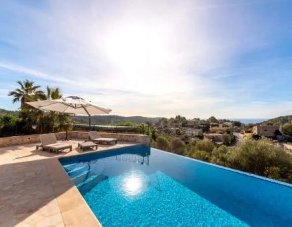 A true highlight is the heated saltwater infinity pool with sea views reaching as far as Santa Ponsa. The sauna, with its panoramic views over the surrounding landscape, provides the perfect place to unwind. The expansive plot includes an orchard, olive trees, and a barbecue area with a pizza oven.