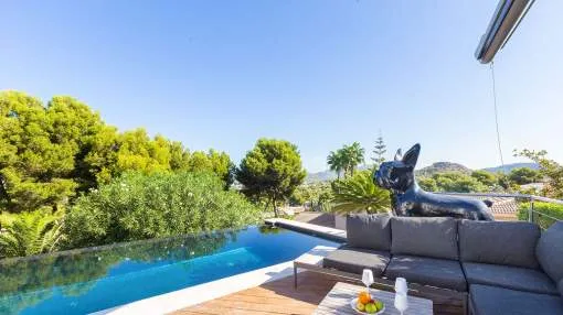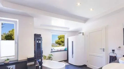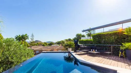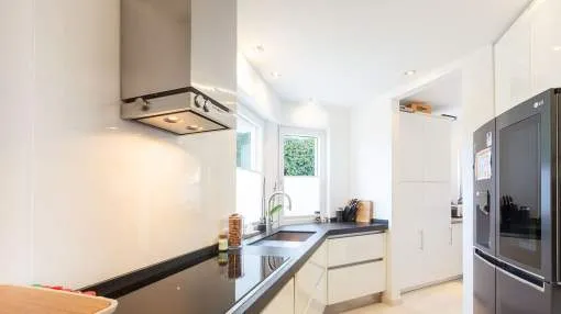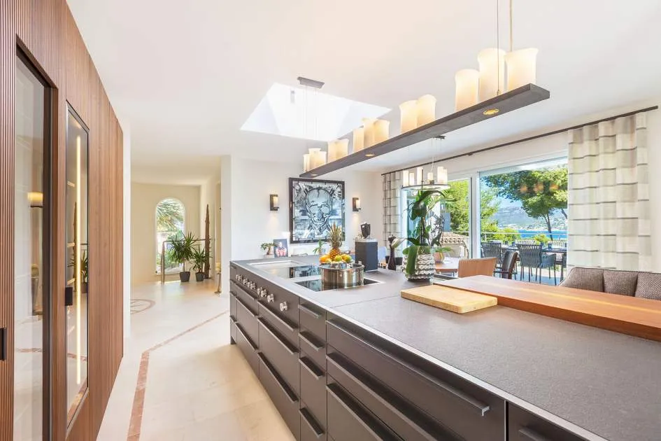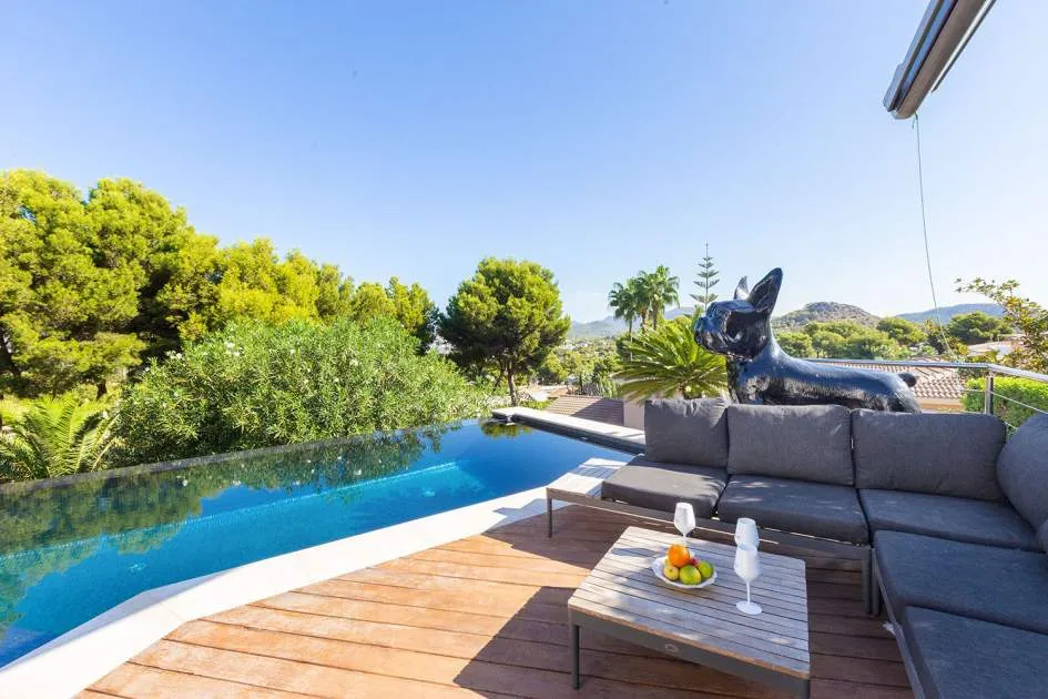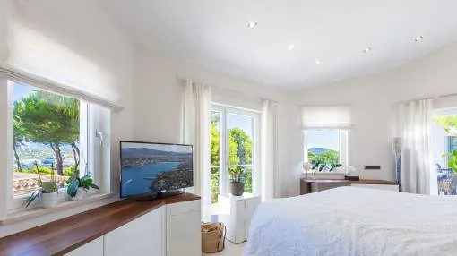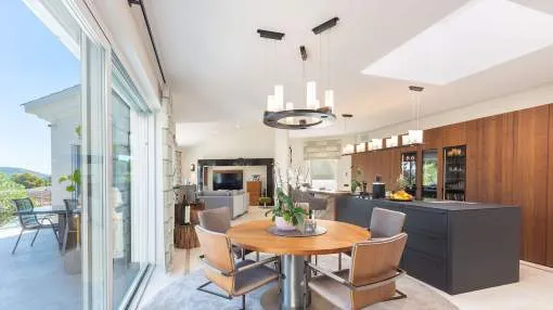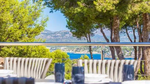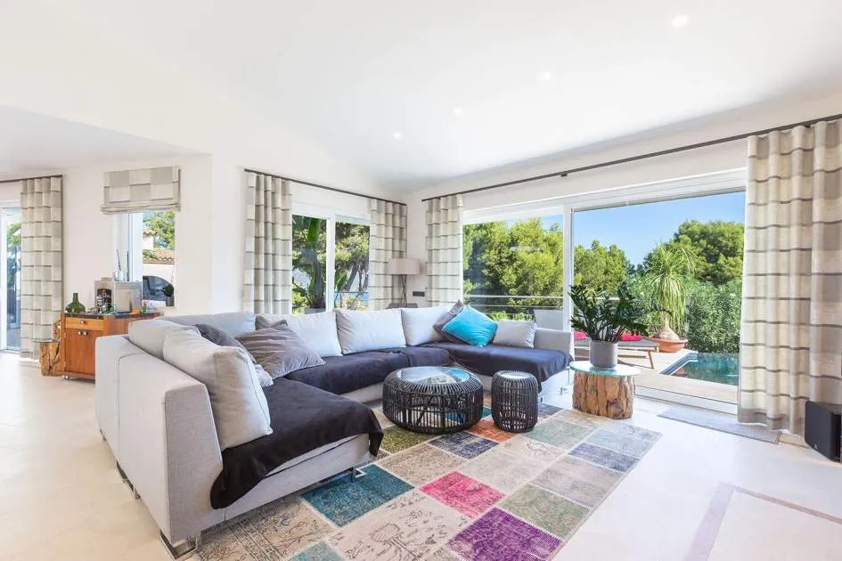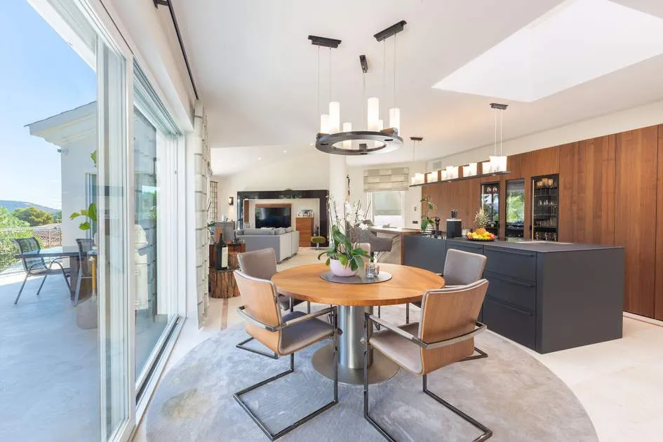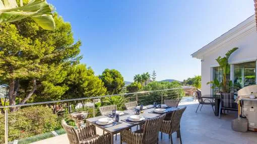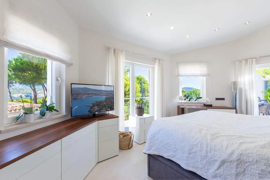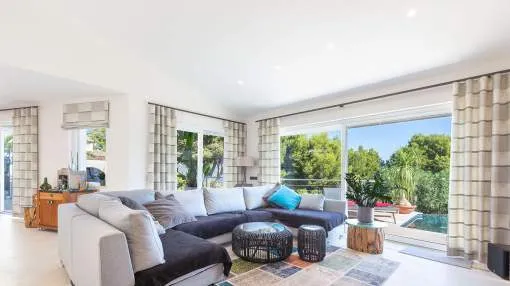 This modern villa is located on a hillside plot in a quiet villa residential area close to the marina Port Adriano with adjacent sandy beach and offers a beautiful panoramic sea view. The golf courses of the region, other marinas and the centre of Santa Ponsa with its extensive infrastructure can be reached in a few minutes by car. The renovated house impresses with spacious rooms and a high-quality, elegant interior with the most modern building services. On the main living level on the ground floor, there is a spacious living/dining room with open luxury kitchen, another kitchen, the master bedroom with bathroom as well as an office and a bathroom. On the lower level, there is a 1-bedroom guest apartment with en suite bathroom (currently a gym), two further bedrooms, also with en suite bathrooms and a sauna en suite, and the double garage. The outdoor area offers inviting open and covered terraces with salt water pool and an automatically irrigated Mediterranean garden with beautiful views of the bay of Santa Ponsa and the mountains.