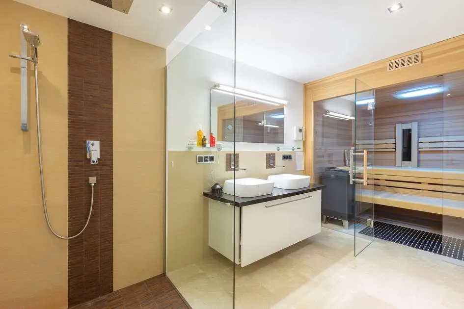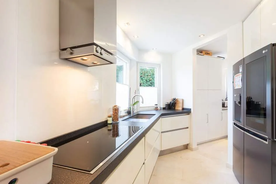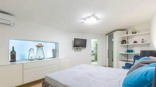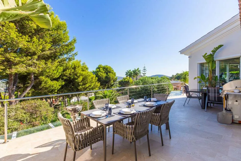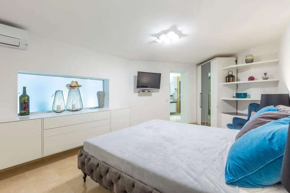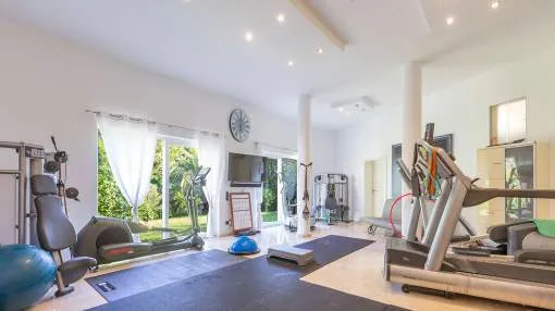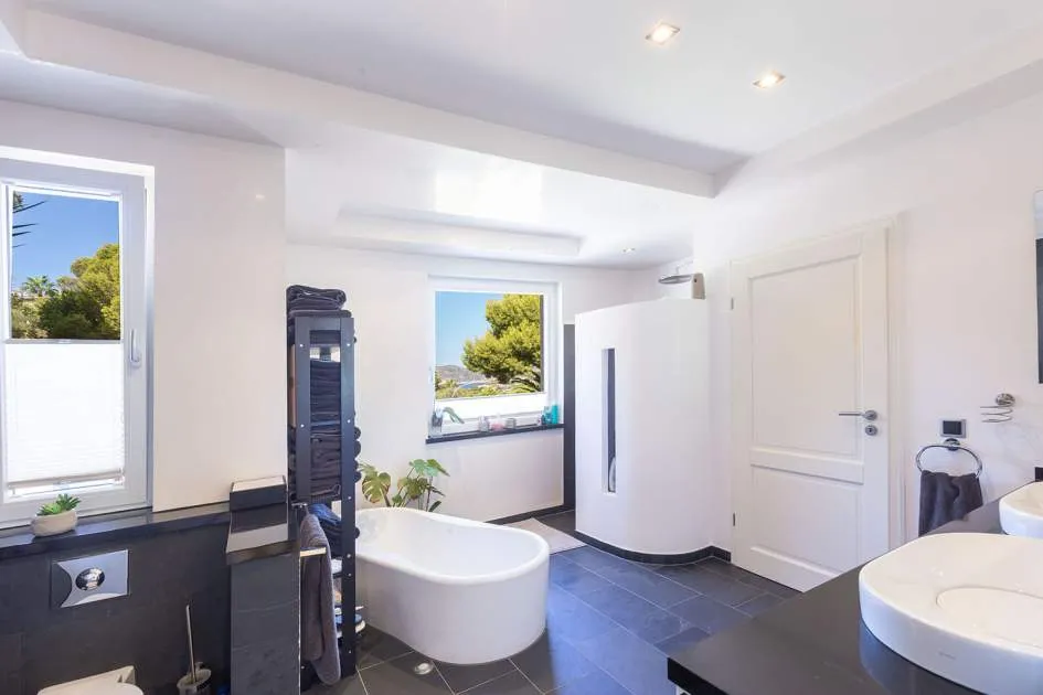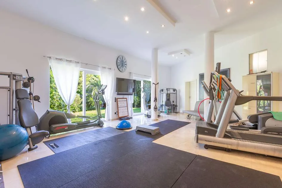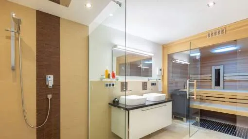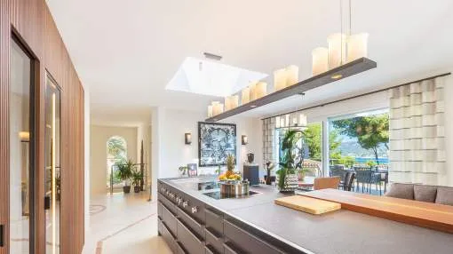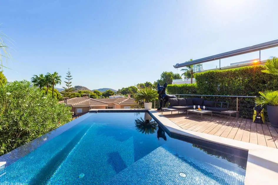 This modern villa is located on a hillside plot in a quiet villa residential area close to the marina Port Adriano with adjacent sandy beach and offers a beautiful panoramic sea view. The golf courses of the region, other marinas and the centre of Santa Ponsa with its extensive infrastructure can be reached in a few minutes by car. The renovated house impresses with spacious rooms and a high-quality, elegant interior with the most modern building services. On the main living level on the ground floor, there is a spacious living/dining room with open luxury kitchen, another kitchen, the master bedroom with bathroom as well as an office and a bathroom. On the lower level, there is a 1-bedroom guest apartment with en suite bathroom (currently a gym), two further bedrooms, also with en suite bathrooms and a sauna en suite, and the double garage. The outdoor area offers inviting open and covered terraces with salt water pool and an automatically irrigated Mediterranean garden with beautiful views of the bay of Santa Ponsa and the mountains.
