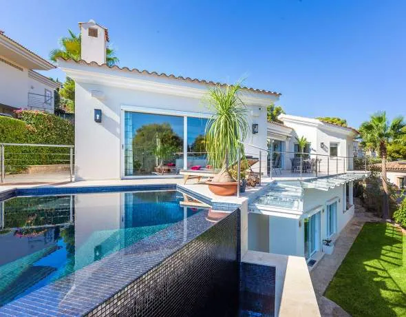 This modern villa is located on a hillside plot in a quiet villa residential area close to the marina Port Adriano with adjacent sandy beach and offers a beautiful panoramic sea view. The golf courses of the region, other marinas and the centre of Santa Ponsa with its extensive infrastructure can be reached in a few minutes by car. The renovated house impresses with spacious rooms and a high-quality, elegant interior with the most modern building services. On the main living level on the ground floor, there is a spacious living/dining room with open luxury kitchen, another kitchen, the master bedroom with bathroom as well as an office and a bathroom. On the lower level, there is a 1-bedroom guest apartment with en suite bathroom (currently a gym), two further bedrooms, also with en suite bathrooms and a sauna en suite, and the double garage. The outdoor area offers inviting open and covered terraces with salt water pool and an automatically irrigated Mediterranean garden with beautiful views of the bay of Santa Ponsa and the mountains.
