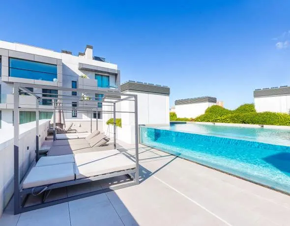 The penthouse sets itself with its sophisticated, elegant interior and spacious rooms, which are flooded with light through floor-to-ceiling glass walls offering magnificent views of Palma. The property includes a 360° panoramic roof terrace with a private pool, jacuzzi, and barbecue area.