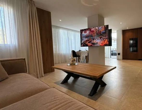 The living area has been designed for maximum comfort, featuring high-quality furnishings, two TVs in the living room and two additional TVs in the bedrooms. Outside, the spacious terrace with electric blinds offers a perfect year-round outdoor living space with a dining area and an outstanding BBQ setup including two charcoal barbecues, one gas barbecue, and an additional grill.