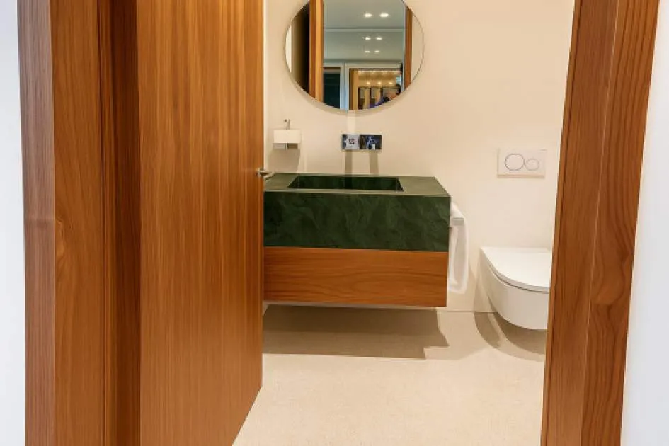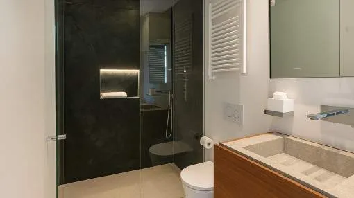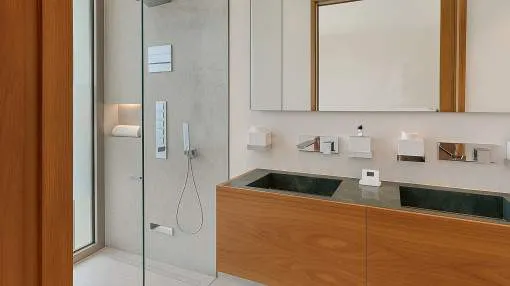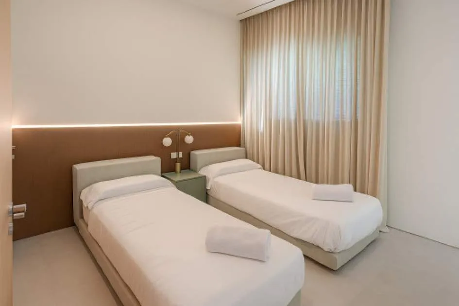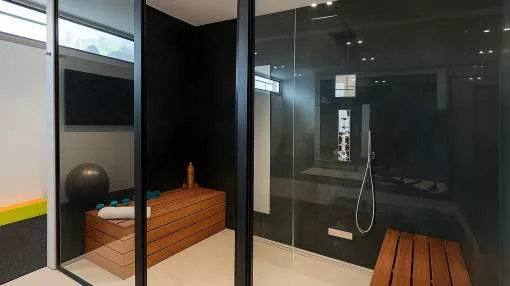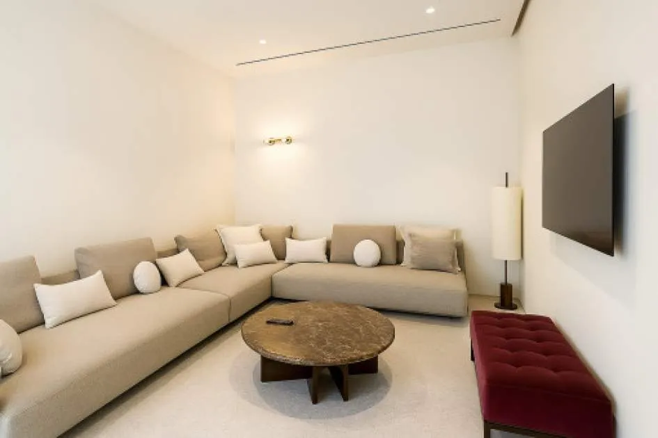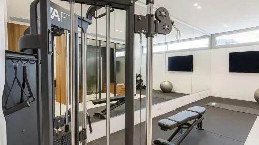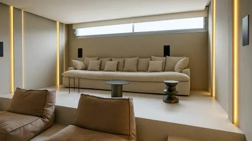 Around 588 m² of built area across three levels accommodate six generous double bedrooms, each with en-suite bathroom. The open-plan living/dining area with floor-to-ceiling windows flows onto expansive, partly covered terraces—perfect for long evenings outdoors. The designer kitchen, fitted with high-quality Italian brands, integrates seamlessly with the clean interior featuring natural stone floors. Private retreats include a home cinema and a fitness room with steam room and its own bathroom; an elevator serves all floors.