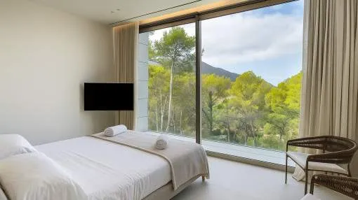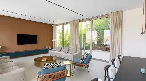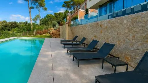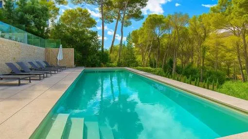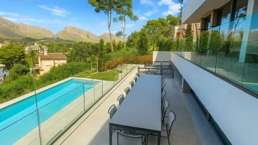 Comfort details: underfloor heating throughout, centrally controlled ducted air-conditioning (hot/cold), aluminium windows with double glazing, ample storage and a low-maintenance garden. The centrepiece outside is the heated pool (approx. 50 m²) framed by sun terraces. The elevated setting opens views of the Tramuntana mountains, while the quiet residential street ensures year-round convenience. Golf (Pollensa, Alcanada) is 5–10 minutes away; Palma/airport approx. 40 minutes.