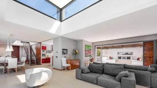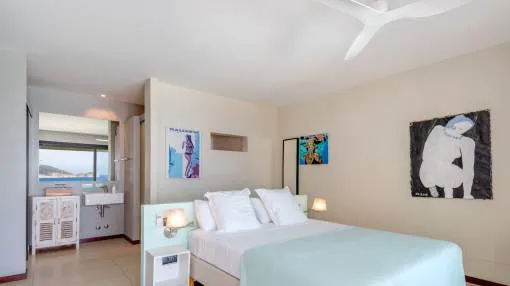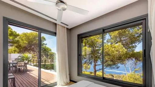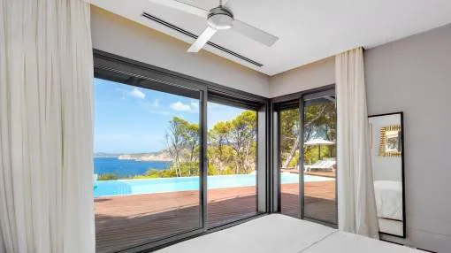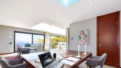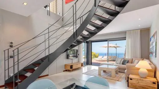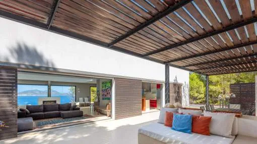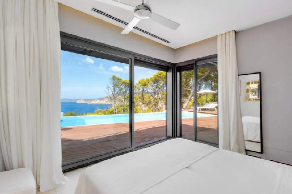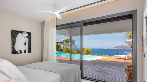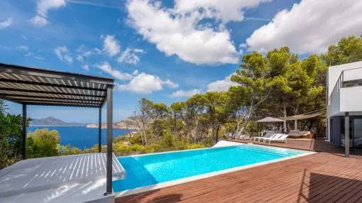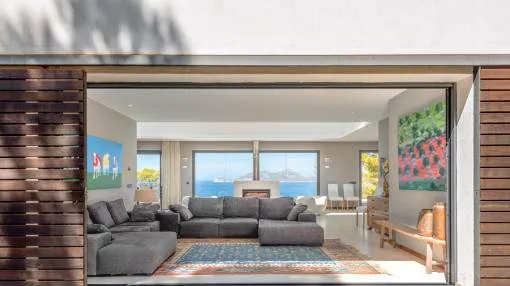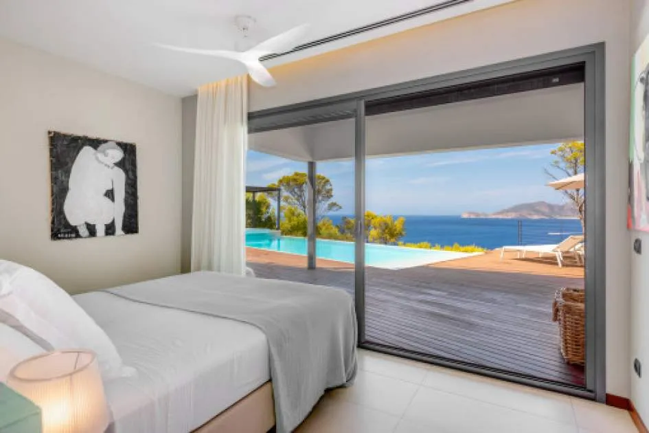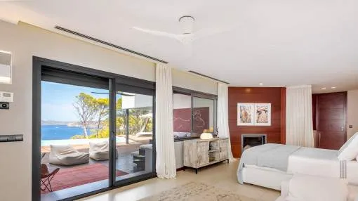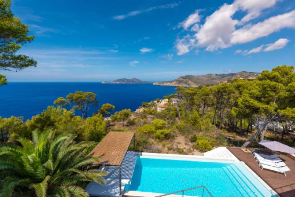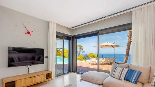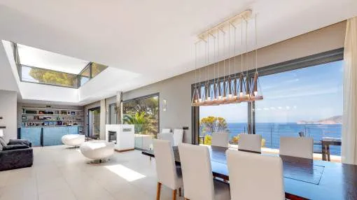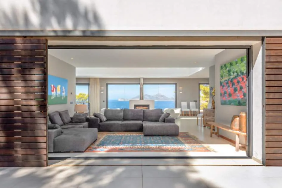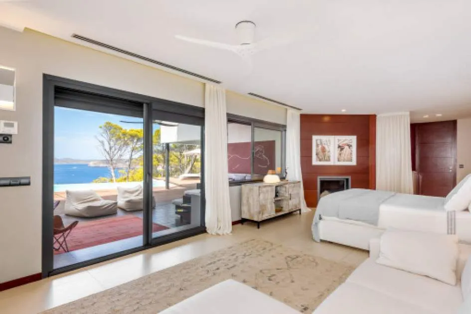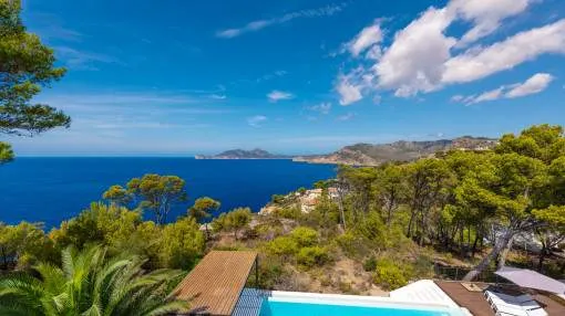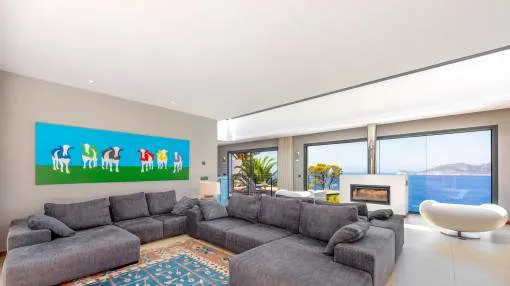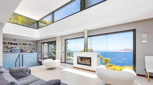 This exceptional villa is enthroned in one of the most exclusive locations in Port d'Andratx and opens up to an endless panorama over the open sea. Here you can experience magical sunsets that turn every evening into an unforgettable spectacle - nestled in absolute tranquillity and complete privacy.