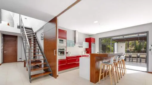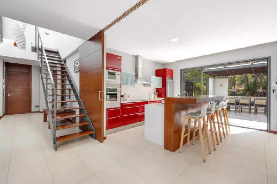 The lower floor offers 4 further bedrooms - each with its own en suite bathroom - another kitchen and a second living/dining area. From every room you have direct access to the spacious pool terrace with its large saltwater pool, where the glistening sea and the gentle sound of the waves create the perfect vacation atmosphere.