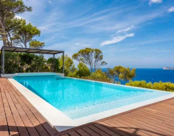This exceptional villa is enthroned in one of the most exclusive locations in Port d'Andratx and opens up to an endless panorama over the open sea. Here you can experience magical sunsets that turn every evening into an unforgettable spectacle - nestled in absolute tranquillity and complete privacy.