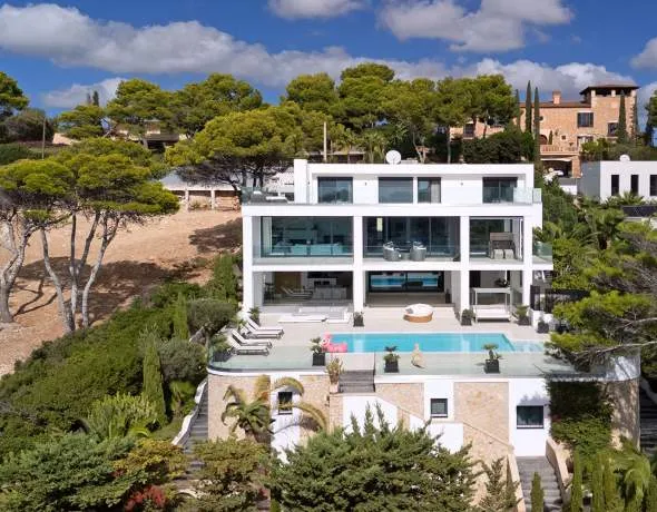 In a privileged, elevated location between the renowned Club Náutico Santa Ponsa and the luxurious marina of Port Adriano, this exceptional villa presents itself as a true gem on Mallorca’s southwest coast. Surrounded by a tranquil, upscale neighbourhood, it guarantees absolute privacy and a prime panoramic setting.