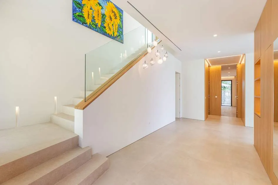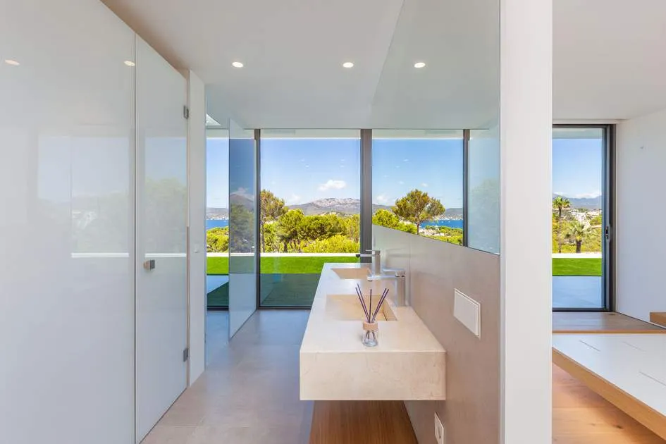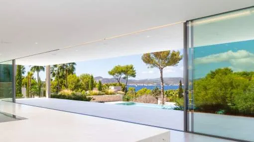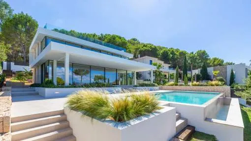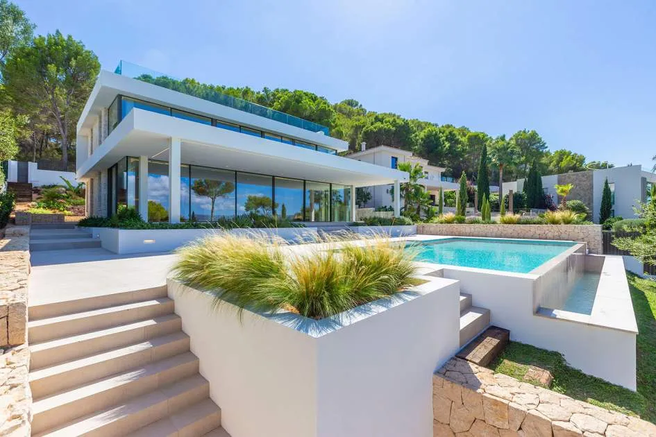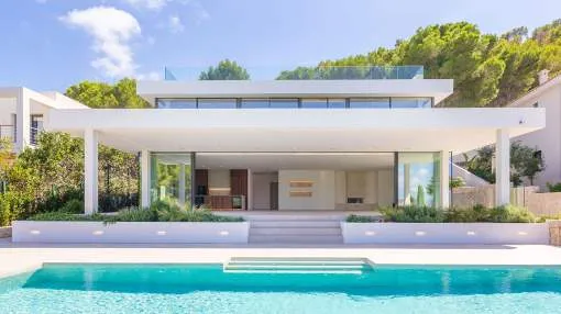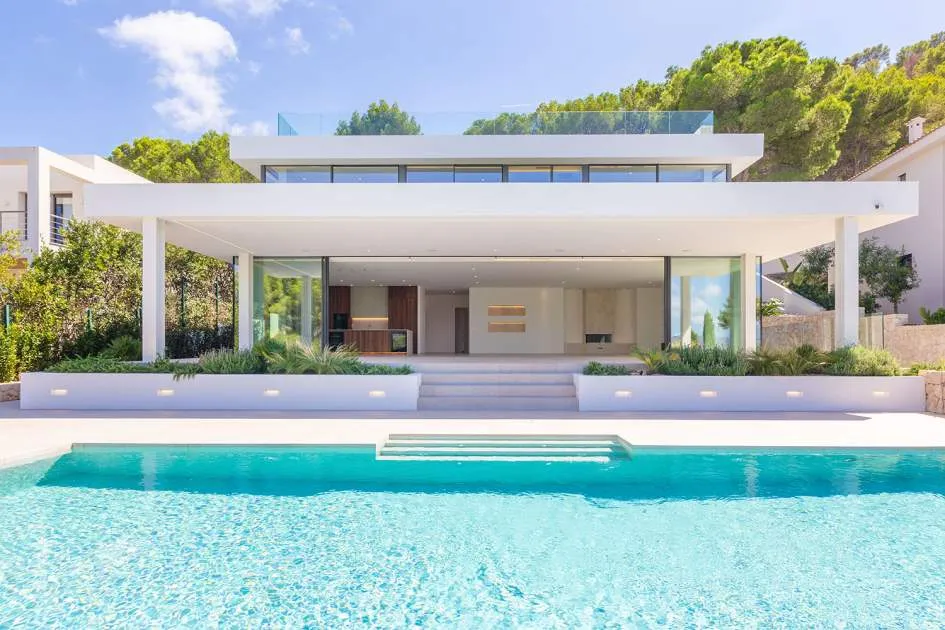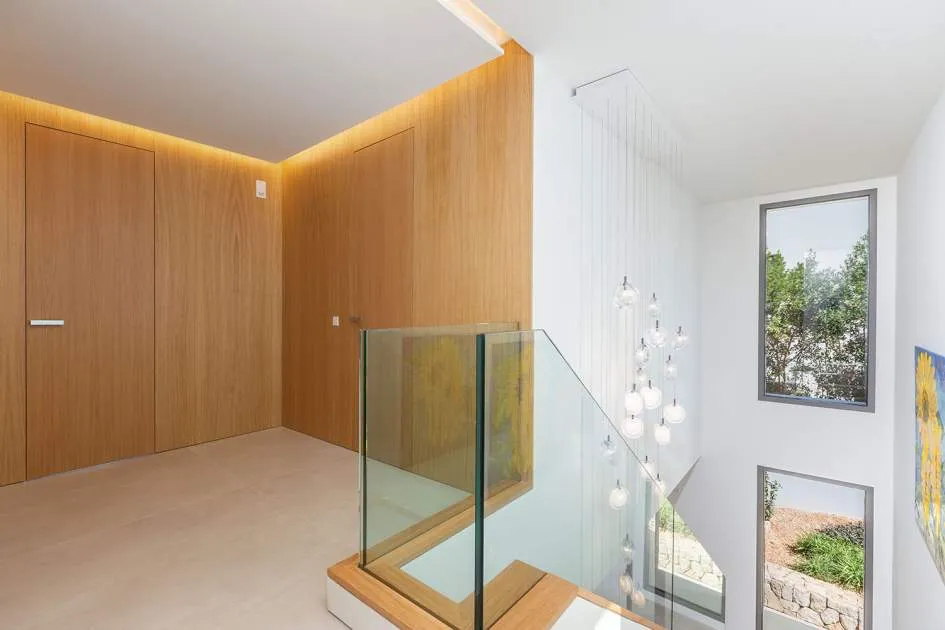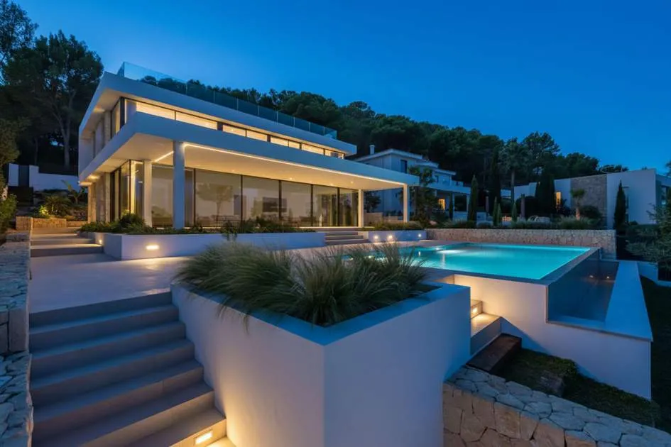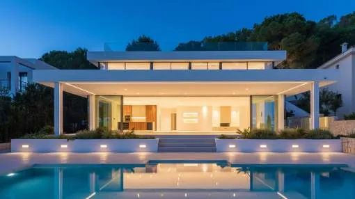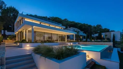 Located in one of the most exclusive villa urbanisations of Santa Ponsa, this stylish new-build villa is a modern retreat with high privacy. The tranquil residential area borders directly on a vast nature reserve, accessible via a permitted garden gate. At the same time, the location impresses with its proximity to the centre: three renowned golf courses and several marinas are in the immediate vicinity. The large sandy beach of Santa Ponsa, idyllic coves, sports and leisure facilities, as well as numerous shopping and dining options, are within few minutes by car.