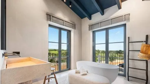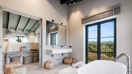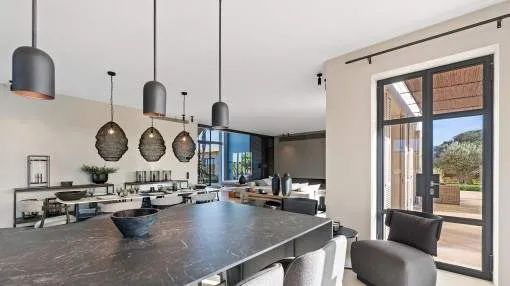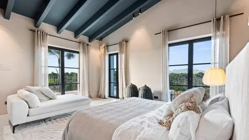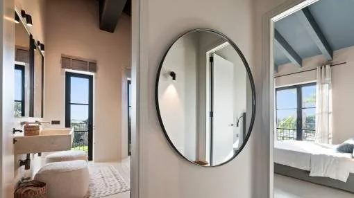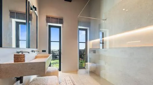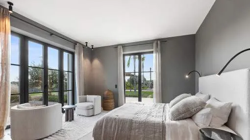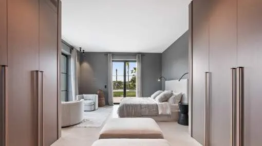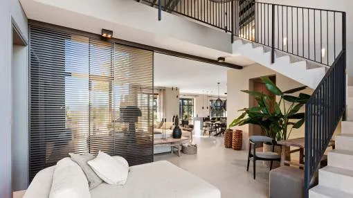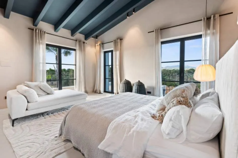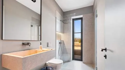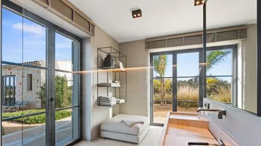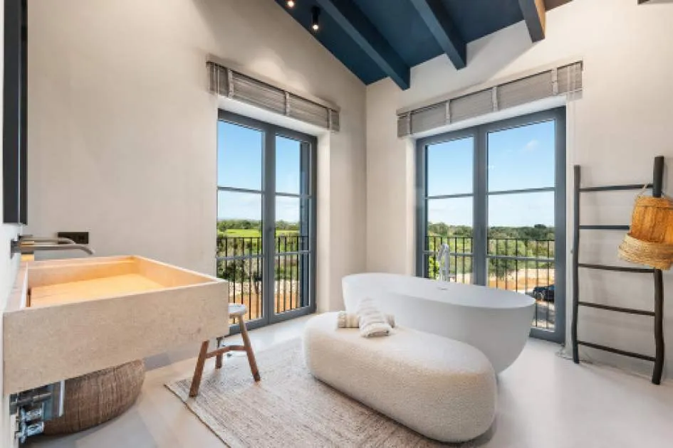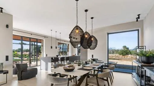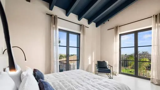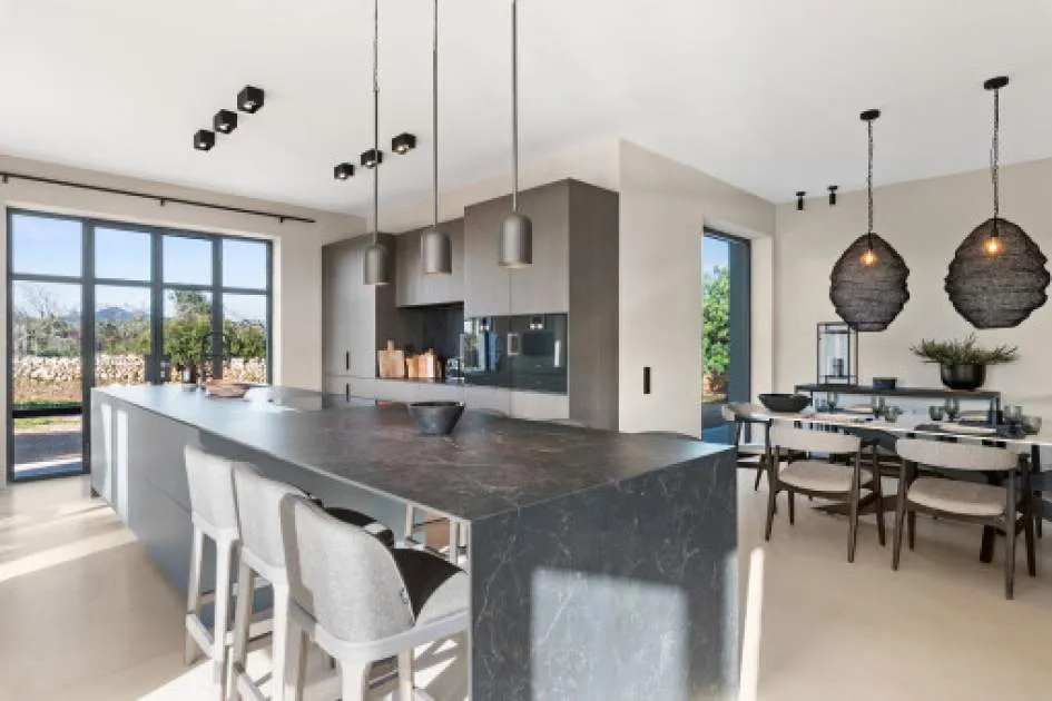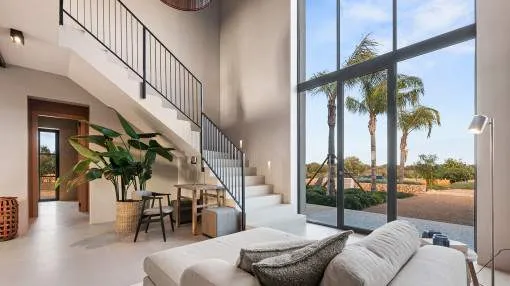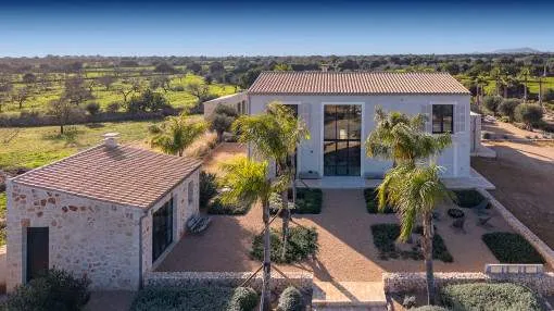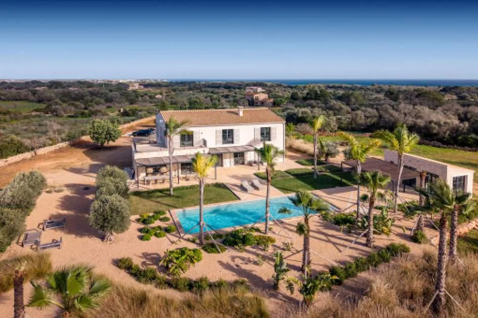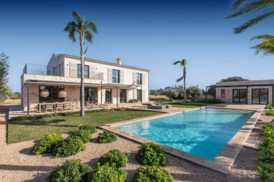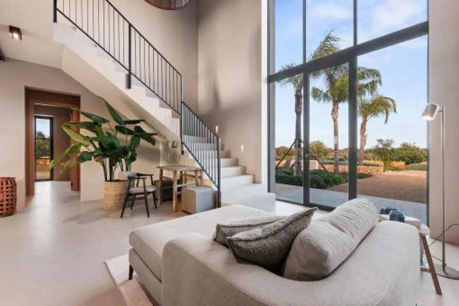 Details: This exclusive new-build finca, due for completion in 2024, is located in the southeast of Mallorca, close to the popular coastal town of Portocolom and Cala Marçal. The location combines peaceful country living with a very good infrastructure: beaches, restaurants, cafés, shopping facilities and the marina of Portocolom can be reached in just a few minutes. Thanks to the good connections, the finca is easily accessible by car and at the same time offers plenty of privacy and nature. The modern architecture combines timeless design with high-quality furnishings and creates a living ambience of the highest standard. As soon as you enter, the spacious entrance area impresses with its extraordinary ceiling height and an open, elegant feeling of space. The light-flooded living and dining area with fireplace flows seamlessly into the high-quality kitchen with Gaggenau appliances. On this level, there is also a spacious bedroom with en-suite bathroom and fitted wardrobes, as well as another room that can be used flexibly, ideal as a guest room or home office. A separate bathroom completes the first floor. On the upper floor, there is an open gallery with sea views, which is designed as an additional living area with a gas fireplace. This level is complemented by two further bedrooms, a bathroom and a spacious master suite with a free-standing bathtub, dressing area and private terrace. The lovingly landscaped outdoor area in Mediterranean style has a large pool, a separate pool house with potential use as a fitness room and a prepared boules court. The extensive plot offers plenty of peace, privacy and space to develop. The high-quality features include underfloor heating, air conditioning and an alarm system. A modern retreat in an idyllic location - ready to move into and ideal as a main or vacation home. Returns from holiday lettings: For initial orientation you can use the “Porta Holiday Returns Calculator” without obligation to calculate your potential returns from holiday letting. NB: Due to the current legal situation it is possible that in certain municipalities renting restrictions may apply, or new touristic licences may not be granted. Your Porta Mallorquina real estate consultant will be pleased to advise you whether the property you have chosen is affected. Go to Returns Calculator. Location & surrounding area: Porto Colom, in the southeast of the island attracts many boating enthusiasts from near and far due to the largest natural harbour of Mallorca. Fishing boats, motorboats, yachts and Majorcan traditional “llauts” are anchored side by side. Beautiful restaurants where you can eat fresh fish border the harbourside promenade. The atmosphere of this small old town irradiates calm and a Mediterranean flair. A charming village for spending magnificent holidays by the sea.