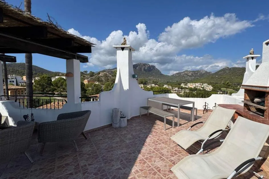 The open plan living and dining area is on the first floor and the modern fitted kitchen has a central cooking island. This level is very bright through the high and large windows enjoying wonderful views over the golf course and across to the Tramuntana mountains. There is also access to the roof terrace, from which you have a wonderful panoramic view over the roofs of Camp de Mar, the golf course and the sea. A summer kitchen invites you to enjoy the Mediterranean lifestyle outdoors.