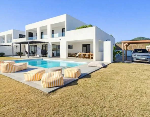 The fully fenced garden offers privacy and features Mediterranean planting, a saltwater swimming pool, a spacious covered terrace, two upper terraces and a carport — perfect for enjoying the island lifestyle.