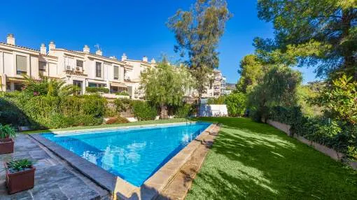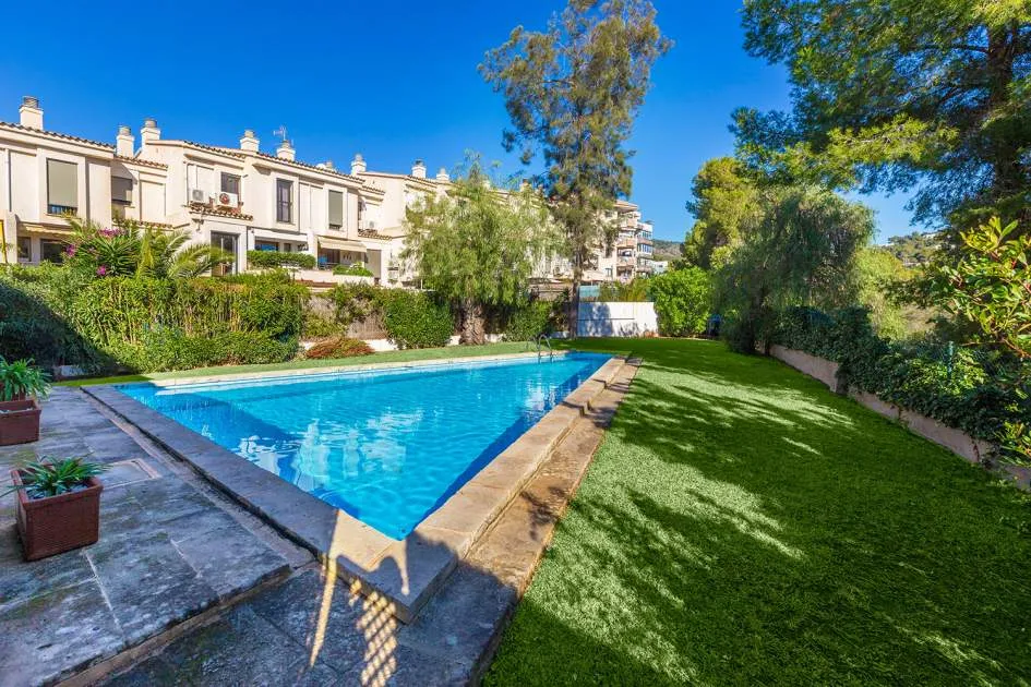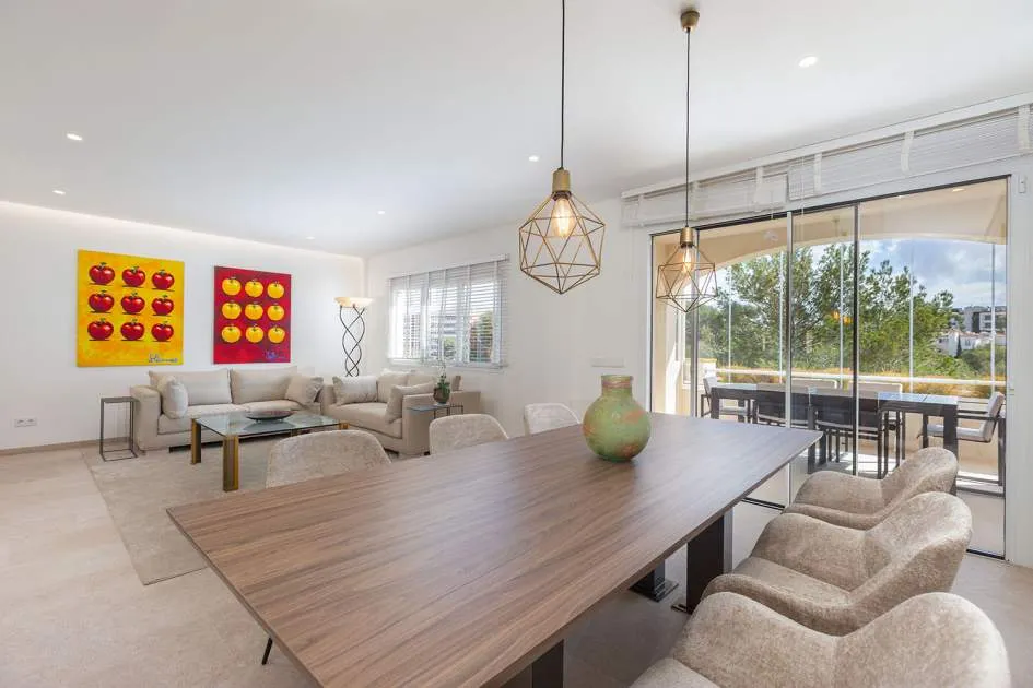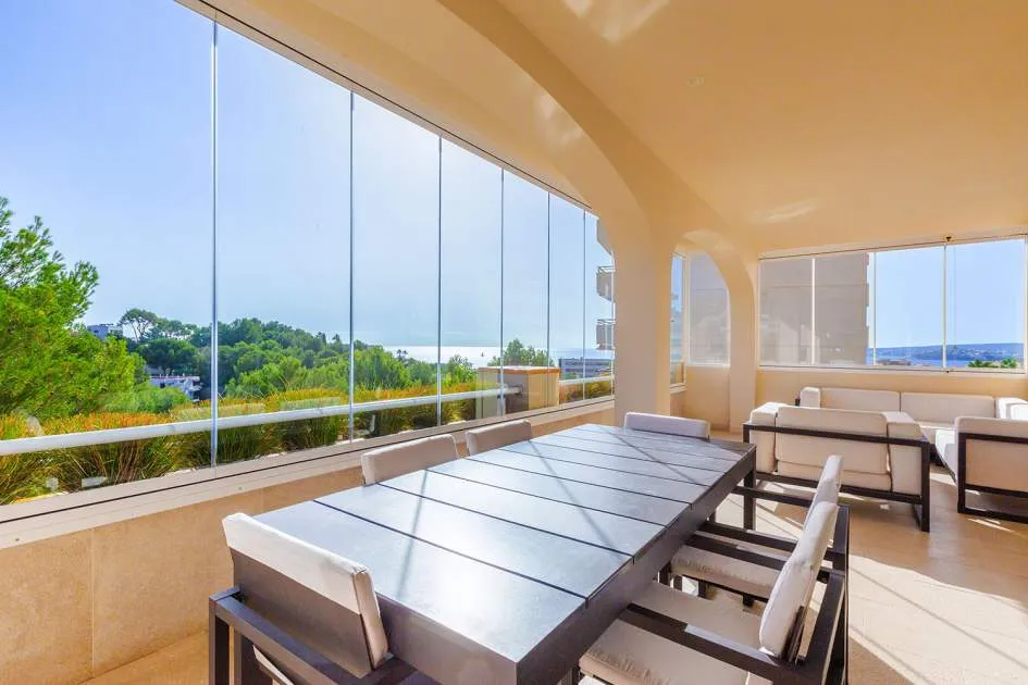 This high quality renovated and elegantly furnished penthouse is located in a small Mediterranean style complex of only six units in a residential area close to the centre. The centre of Portals Nous and the exclusive port of Puerto Portals with its adjacent sandy beach are within walking distance. Several golf courses, beautiful beaches as well as the coastal resorts with all amenities and other marinas of the southwest are only a few minutes drive away. In addition, the luxurious duplex apartment offers a spacious covered sea view terrace on the entrance level and an 85m² sun terrace with pergola, BBQ area, lounge, adjoining bedroom with dressing room and bathroom as well as sensational sea and panoramic views. The owners also have access to a well maintained communal garden, swimming pool and parking spaces. There is also a parking space in the underground car park of the neighbouring residence.