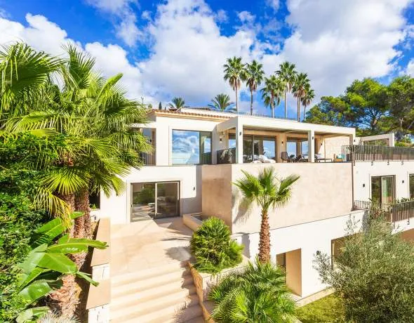 This excellent, southwest-facing villa is set in a tranquil residential area, close to the centre and only a short drive from the local beaches, golf courses and marinas. Within walking distance to the sea, one benefits from the exclusivity of one of the most sought-after residential areas of Santa Ponsa. And close to the existing, extensive infrastructure of the southwest of the island, with Palma and the airport only 25 – 30 minutes’ drive away. The property boasts light-flooded rooms with top of the range fixtures and fittings. The main living area on the top floor is divided into the living/dining room with an open plan kitchen and access to the beautiful pool terrace with a cosy lounge, summer kitchen and stunning panoramic sea views, plus a guest toilet. The ground floor entrance level features the master bedroom with dressing room and bathroom and another three bedrooms with en suite bathrooms. On the lower floor there is one bedroom with bathroom, a gym with sauna and bathroom, a bodega, a utility room, a storeroom, an engine room, and a double garage. All levels are connected by means of an elevator.