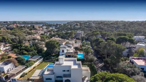 Details: This impressive villa is situated in an exclusive residential area in Costa d'en Blanes, and pampers its occupants with breathtaking panoramic views of the sea and the picturesque bay of Palmanova. A true jewel of a property which has recently undergone a complete and stylish renovation, it now presents itself with a bright, modern and airy design offering the highest level of home comfort. After passing through the elegant entrance area, the spacious, open living/dining area provides a flowing transition to the outside areas. A fully-equipped contemporary kitchen opens on to a charming sea-view terrace and the pool which invites to relax and discover the Mediterranean way of life. Also on this level is a large bedroom offering comfort and privacy for guests. On the upper floor is the exquisite main bedroom with luxurious en-suite bathroom, and 2 further elegant bedrooms each with private bathroom. The master bedroom and one of the guest bedrooms open on to a covered terrace with wonderful sea views from where the beautiful surroundings can be enjoyed to the full. At the rear of the property enchanting views over the glittering bay of Palma can be enjoyed, and from here there is direct access to an adjoining green zone. A large terrace presents the ideal place to relax in the Mediterranean sun whilst enjoying the breathtaking views. Further exclusive features include a parking area, a modern lift, and underfloor heating and hot/cold air conditioning assuring pleasant temperatures all year round. Returns from holiday lettings: For initial orientation you can use the “Porta Holiday Returns Calculator” without obligation to calculate your potential returns from holiday letting. NB: Due to the current legal situation it is possible that in certain municipalities renting restrictions may apply, or new touristic licences may not be granted. Your Porta Mallorquina real estate consultant will be pleased to advise you whether the property you have chosen is affected. Go to Returns Calculator. Location & surrounding area: One of the most exclusive areas of the island is Costa d’en Blanes. The houses and villas are situated above from Portals Nous and due to the hillside situation offering a beautiful view to the sea and the port. The urbanization has a security guard. You find various beaches, the famous Puerto Portals, the attractions centre Marineland of exotic animals, bars, restaurants, banks and medical attendance near to.
