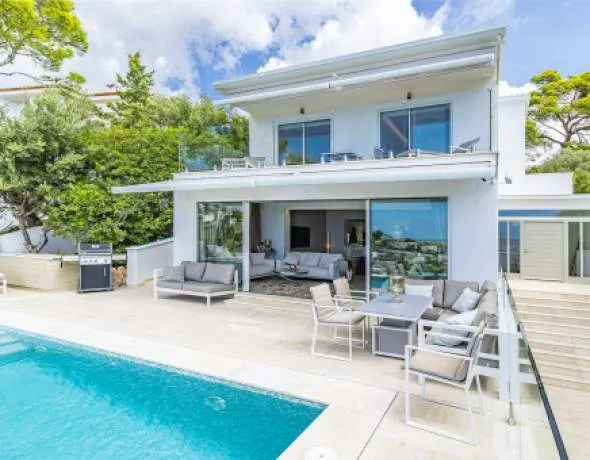 Details: This impressive villa is situated in an exclusive residential area in Costa d'en Blanes, and pampers its occupants with breathtaking panoramic views of the sea and the picturesque bay of Palmanova. A true jewel of a property which has recently undergone a complete and stylish renovation, it now presents itself with a bright, modern and airy design offering the highest level of home comfort. After passing through the elegant entrance area, the spacious, open living/dining area provides a flowing transition to the outside areas. A fully-equipped contemporary kitchen opens on to a charming sea-view terrace and the pool which invites to relax and discover the Mediterranean way of life. Also on this level is a large bedroom offering comfort and privacy for guests. On the upper floor is the exquisite main bedroom with luxurious en-suite bathroom, and 2 further elegant bedrooms each with private bathroom. The master bedroom and one of the guest bedrooms open on to a covered terrace with wonderful sea views from where the beautiful surroundings can be enjoyed to the full. At the rear of the property enchanting views over the glittering bay of Palma can be enjoyed, and from here there is direct access to an adjoining green zone. A large terrace presents the ideal place to relax in the Mediterranean sun whilst enjoying the breathtaking views. Further exclusive features include a parking area, a modern lift, and underfloor heating and hot/cold air conditioning assuring pleasant temperatures all year round. Returns from holiday lettings: For initial orientation you can use the “Porta Holiday Returns Calculator” without obligation to calculate your potential returns from holiday letting. NB: Due to the current legal situation it is possible that in certain municipalities renting restrictions may apply, or new touristic licences may not be granted. Your Porta Mallorquina real estate consultant will be pleased to advise you whether the property you have chosen is affected. Go to Returns Calculator. Location & surrounding area: One of the most exclusive areas of the island is Costa d’en Blanes. The houses and villas are situated above from Portals Nous and due to the hillside situation offering a beautiful view to the sea and the port. The urbanization has a security guard. You find various beaches, the famous Puerto Portals, the attractions centre Marineland of exotic animals, bars, restaurants, banks and medical attendance near to.