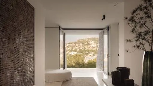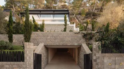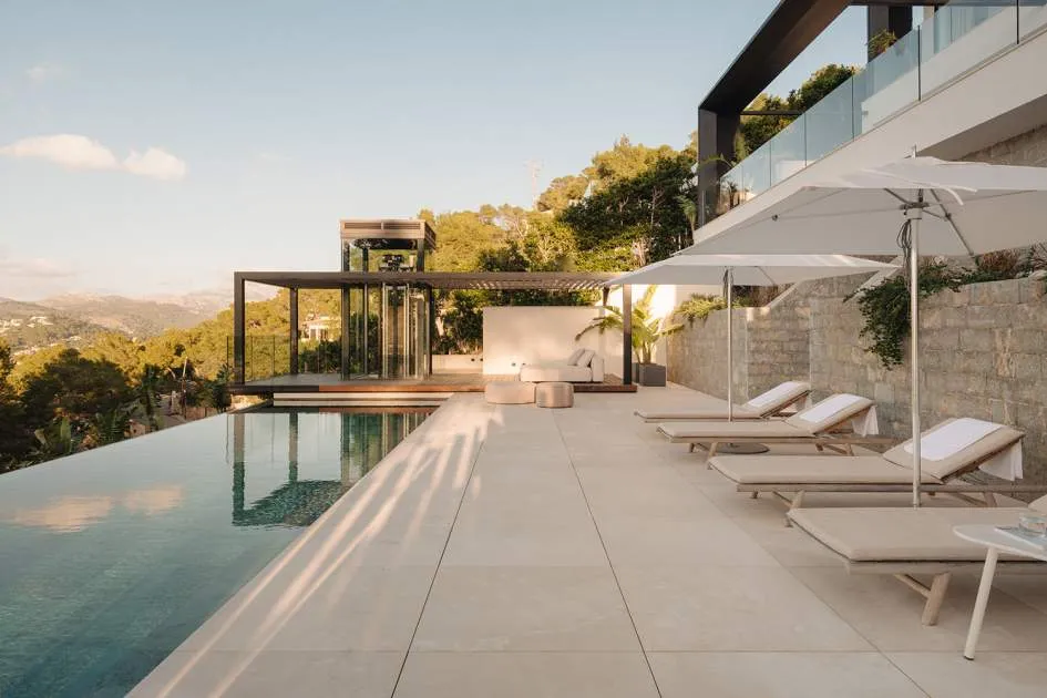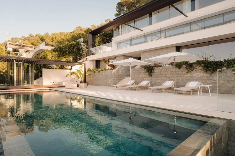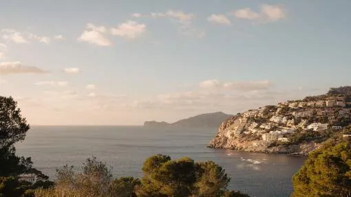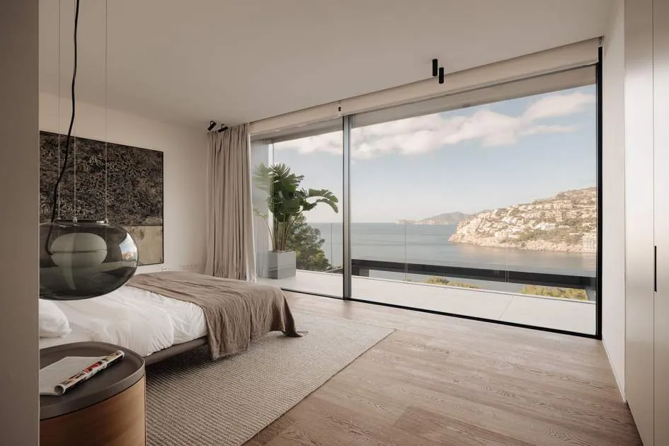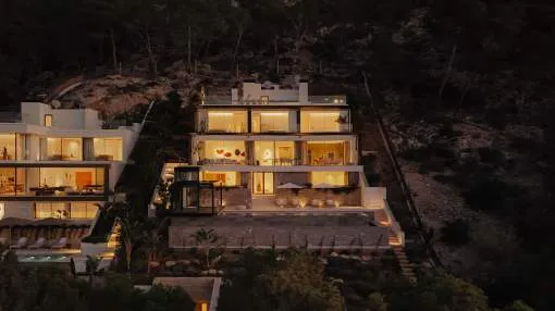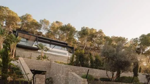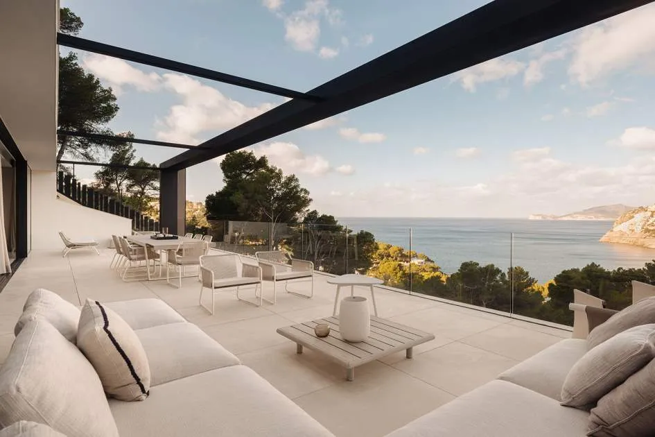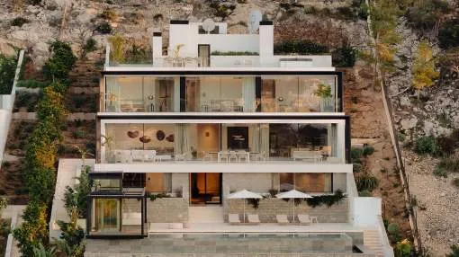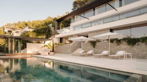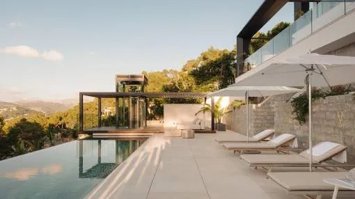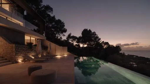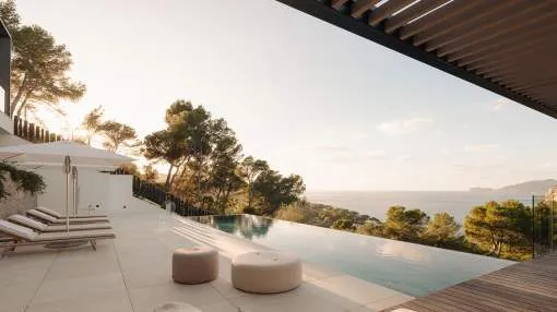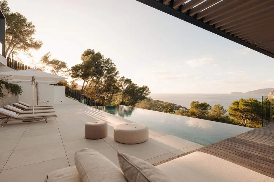 In a highly desirable villa residential location, high above the peninsula of La Mola with views of the harbour exit of Port Andratx to the island of Dragonera, this modern villa with lift was completed in 2022 to the highest quality and finishes. The luxurious villa was designed by the award-winning architectural firm Saota and enjoys wonderful sea and panoramic views. The main living area features a bright living/dining room with open-plan designer kitchen by Poliform, a guest toilet and a large terrace. The upper floor offers three spacious bedroom suites with sea view terrace and access to a Bali-style patio. The two guest suites, the fitness area, the sauna and the wine cellar are located in the basement. Furthermore, a large garage for at least 4 vehicles is available in the basement. Outside, the villa convinces with spacious open terrace areas with embedded infinity swimming pool and the large roof terrace with unique harbour and sea views.