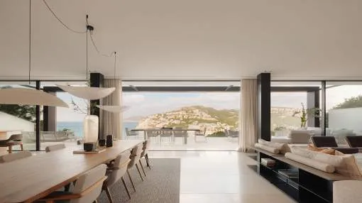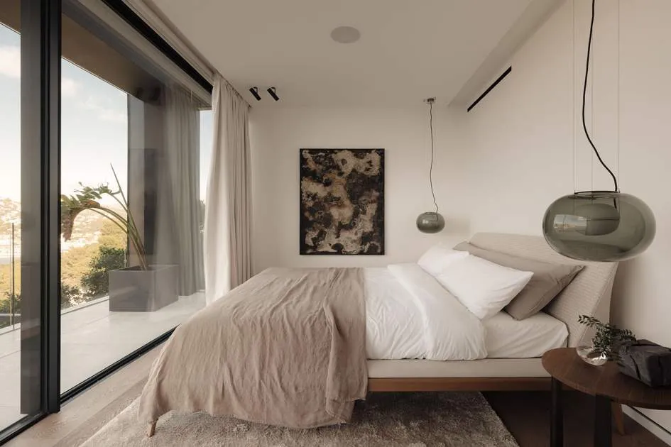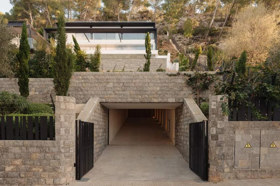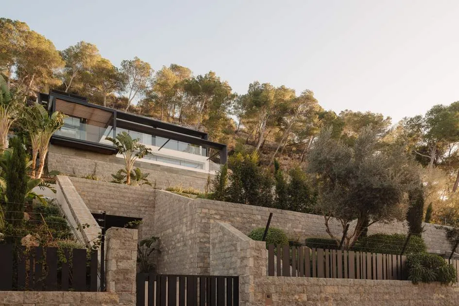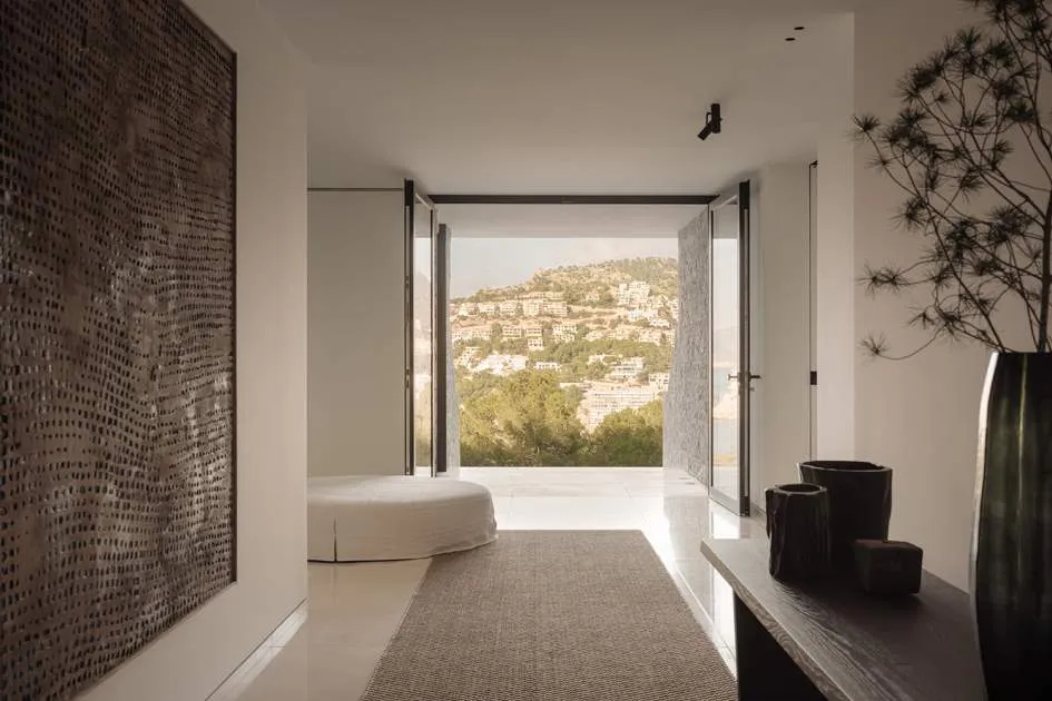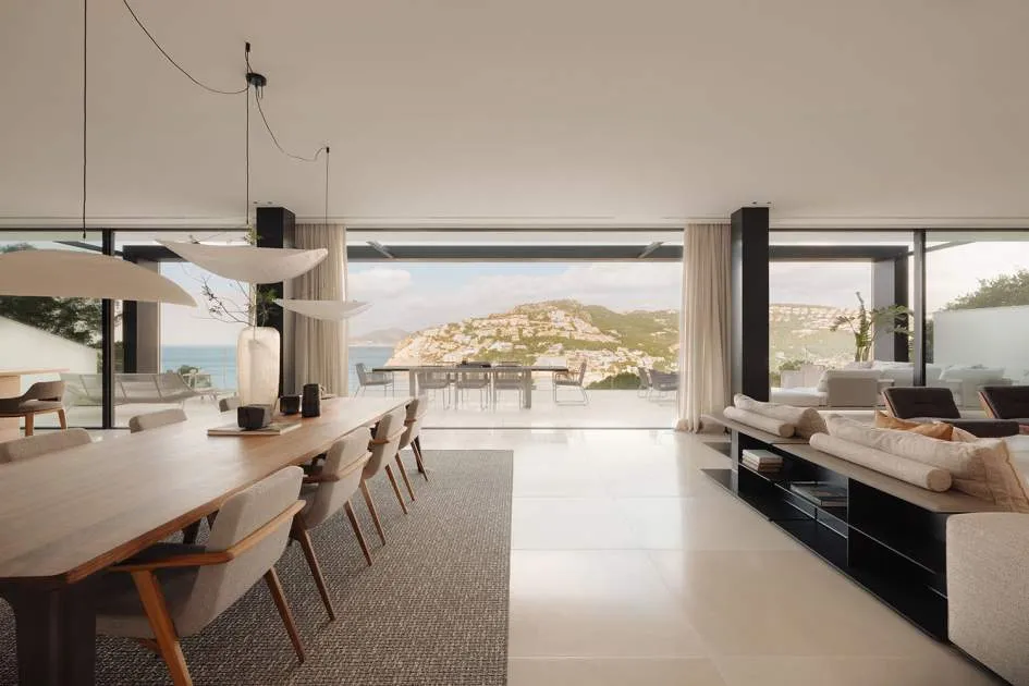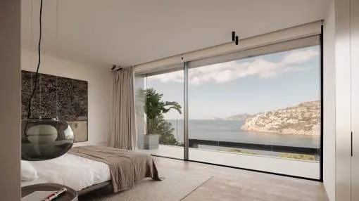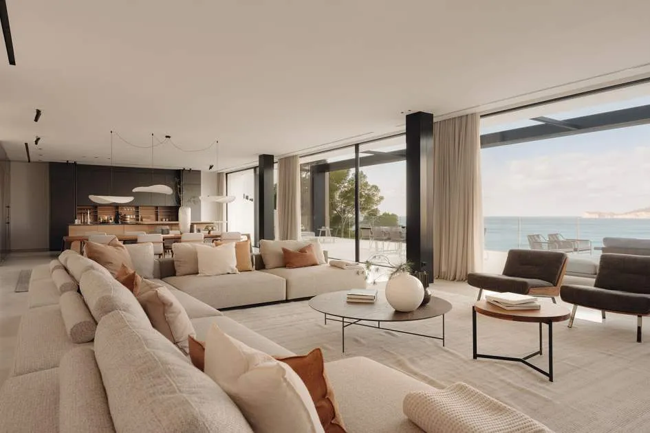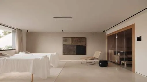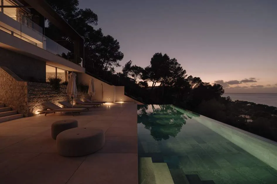 In a highly desirable villa residential location, high above the peninsula of La Mola with views of the harbour exit of Port Andratx to the island of Dragonera, this modern villa with lift was completed in 2022 to the highest quality and finishes. The luxurious villa was designed by the award-winning architectural firm Saota and enjoys wonderful sea and panoramic views. The main living area features a bright living/dining room with open-plan designer kitchen by Poliform, a guest toilet and a large terrace. The upper floor offers three spacious bedroom suites with sea view terrace and access to a Bali-style patio. The two guest suites, the fitness area, the sauna and the wine cellar are located in the basement. Furthermore, a large garage for at least 4 vehicles is available in the basement. Outside, the villa convinces with spacious open terrace areas with embedded infinity swimming pool and the large roof terrace with unique harbour and sea views.
