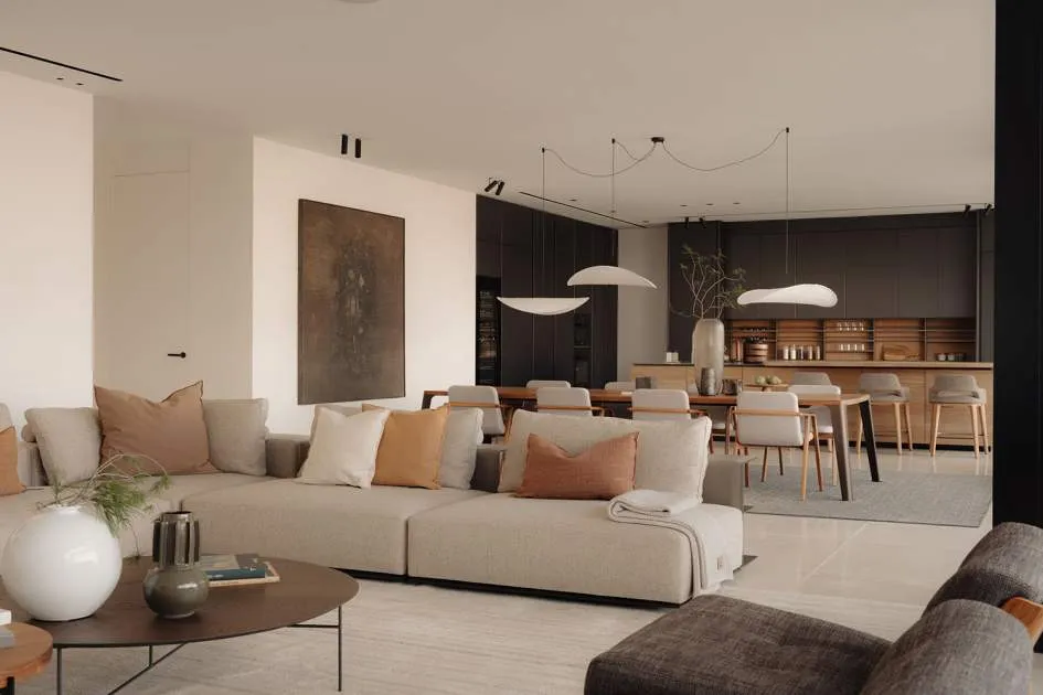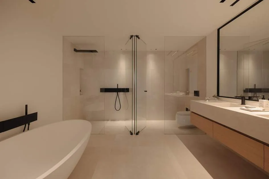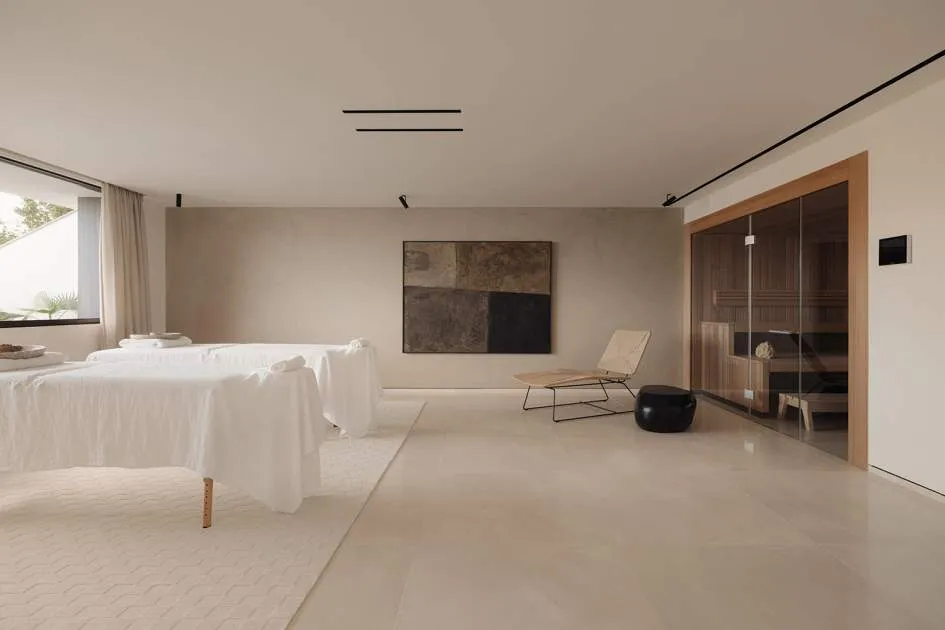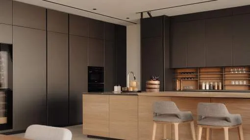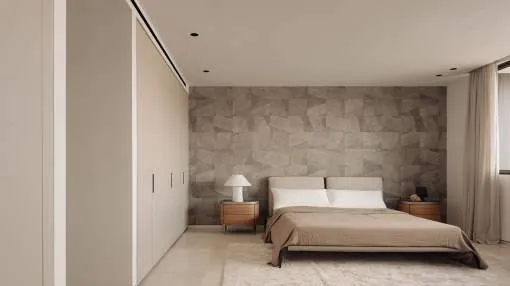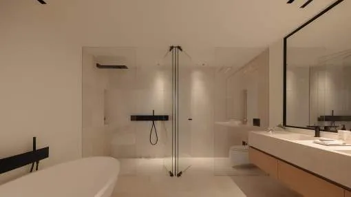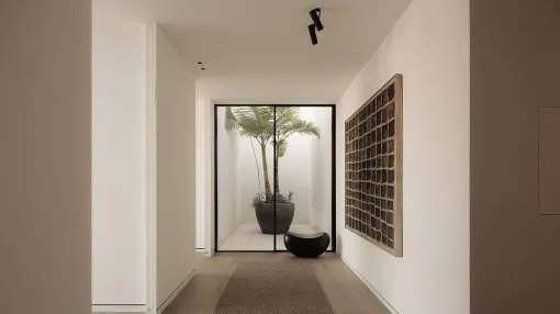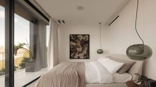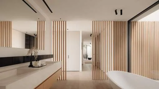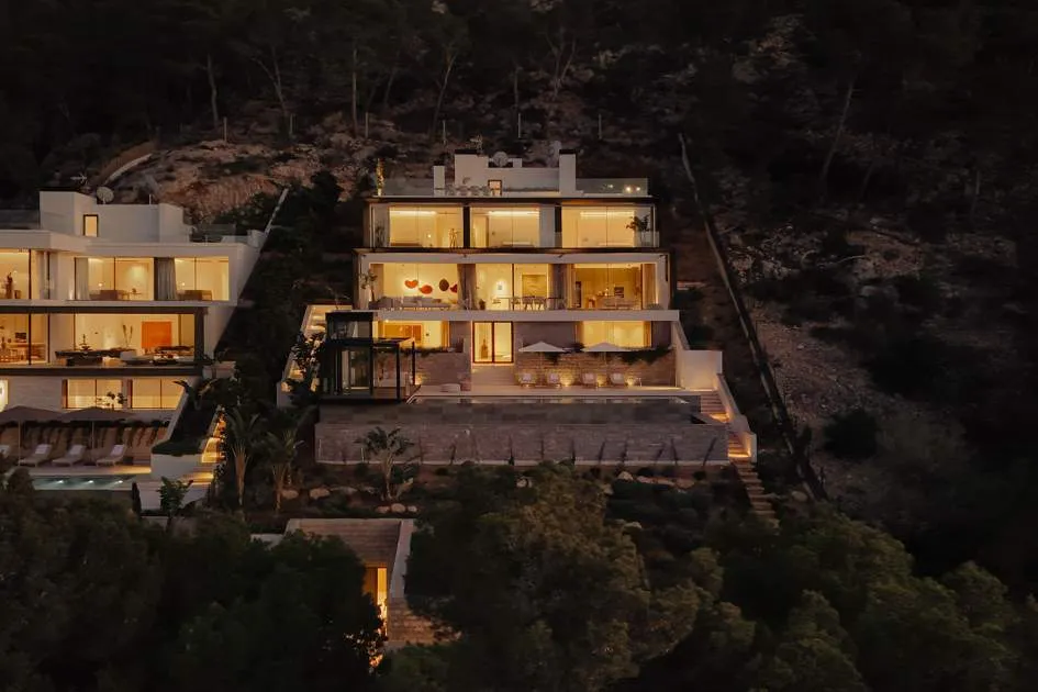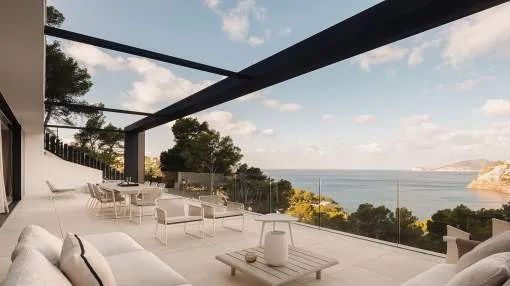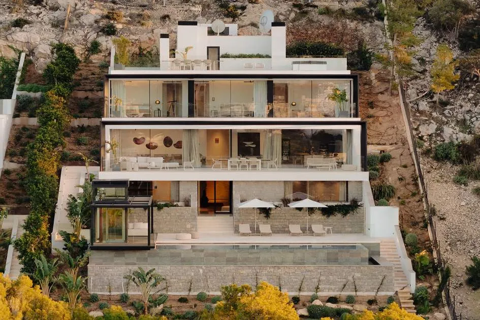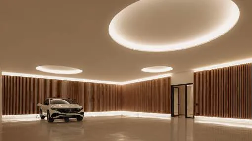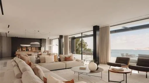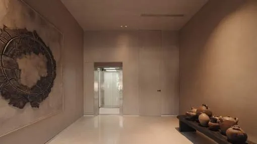 In a highly desirable villa residential location, high above the peninsula of La Mola with views of the harbour exit of Port Andratx to the island of Dragonera, this modern villa with lift was completed in 2022 to the highest quality and finishes. The luxurious villa was designed by the award-winning architectural firm Saota and enjoys wonderful sea and panoramic views. The main living area features a bright living/dining room with open-plan designer kitchen by Poliform, a guest toilet and a large terrace. The upper floor offers three spacious bedroom suites with sea view terrace and access to a Bali-style patio. The two guest suites, the fitness area, the sauna and the wine cellar are located in the basement. Furthermore, a large garage for at least 4 vehicles is available in the basement. Outside, the villa convinces with spacious open terrace areas with embedded infinity swimming pool and the large roof terrace with unique harbour and sea views.