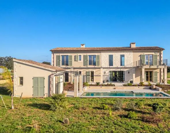 This exceptional finca property, which combines modern architecture with Mallorcan authenticity, is being situated between the vineyards of Sencelles. Natural stone, warm wooden elements and selected materials create an atmosphere of timeless elegance. The panoramic view stretches across its own vineyards to the Tramuntana and the historic village church. The property is framed by traditional dry stone walls and a lovingly landscaped Mediterranean garden; an old olive tree at the entrance welcomes residents and guests.