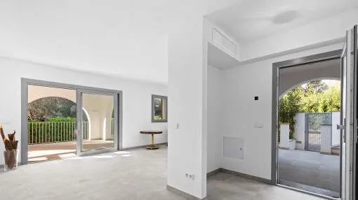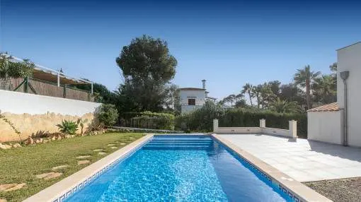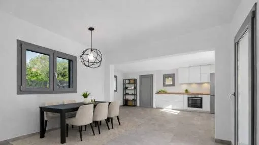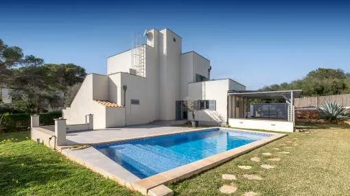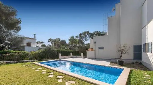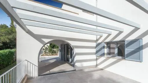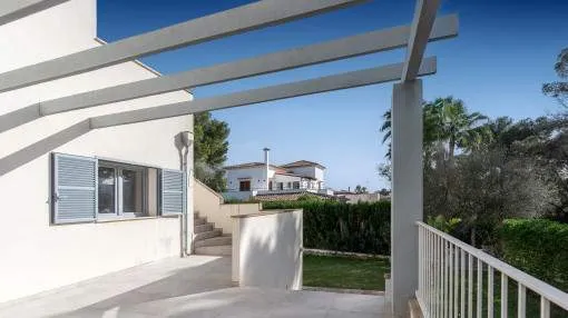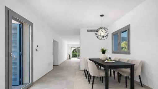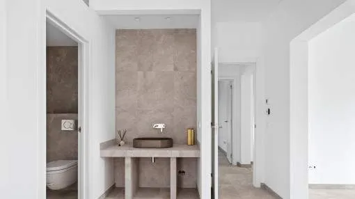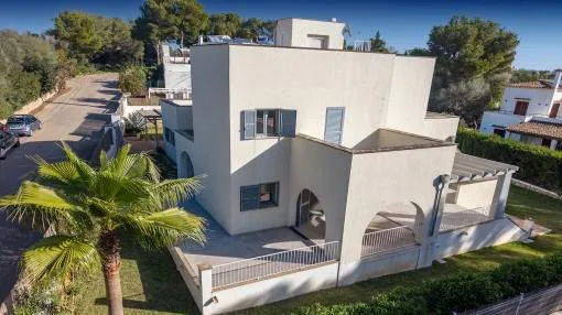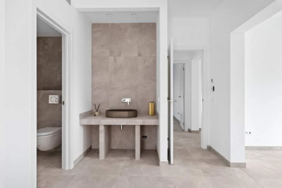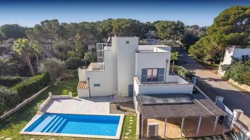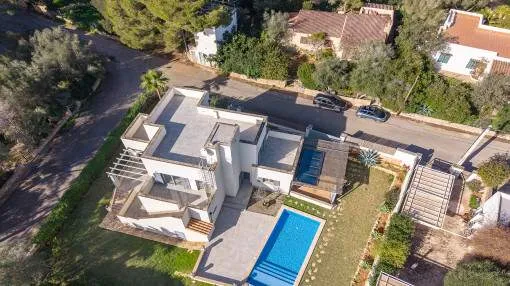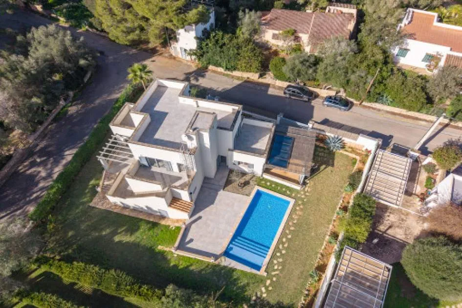 Details: This detached newly built villa combines contemporary architecture, high-quality construction and an attractive location in Portopetro, just a few minutes from the charming harbor. The property extends over 3 levels and offers maximum living comfort in one of the most sought-after areas of the region. An elevator conveniently connects all floors of the house. Each level features spacious terraces, creating seamless transitions between indoor and outdoor living. A particular highlight is the expansive rooftop terrace with stunning sea views, perfect for relaxing evenings or social gatherings. The villa is equipped with air conditioning and underfloor heating throughout the entire house, including the shower areas. The heating and piping systems are by Rehau and stand out for their quality, durability and especially quiet operation thanks to insulated wastewater and fresh water pipes. The heating system is based on a modern heat pump with an 800-liter storage tank located in the basement. A well-designed energy concept ensures that hot water is generated first via solar energy and subsequently via the heat pump. Thanks to excellent insulation, double-glazed PVC windows and state-of-the-art construction, the house is highly energy efficient. The property offers great potential for individual customization. Existing connections allow, among other things, the installation of a corner bathtub, an outdoor kitchen on the rooftop terrace and another outdoor kitchen in the pool area. The installation of a sauna in the bathroom is also feasible. The outdoor area impresses with a large garden, a spacious swimming pool and a high level of privacy. A carport for two vehicles and an electric entrance gate complete this exclusive offer. This villa represents the perfect combination of modern luxury, sustainable technology and an excellent location—ideal as a stylish permanent residence or a high-end holiday home. Returns from holiday lettings: For initial orientation you can use the “Porta Holiday Returns Calculator” without obligation to calculate your potential returns from holiday letting. NB: Due to the current legal situation it is possible that in certain municipalities renting restrictions may apply, or new touristic licences may not be granted. Your Porta Mallorquina real estate consultant will be pleased to advise you whether the property you have chosen is affected. Go to Returns Calculator. Location & surrounding area: Portopetro is a quiet and charming coastal village in the southeast of Mallorca that has retained its authentic character. Away from mass tourism, it offers a relaxed Mediterranean atmosphere and is ideal for those who value peace and quality of life close to the sea. Despite its idyllic setting, Portopetro boasts excellent infrastructure, with numerous restaurants, cafés, and small shops within walking distance, offering a diverse culinary selection. The picturesque marina forms the heart of the village, inviting leisurely walks along the waterfront and moments of relaxation. Particularly appealing is the proximity to two beaches, both easily accessible on foot. These provide ideal conditions for swimming, relaxation, and water sports activities. The combination of tranquillity, maritime charm, and short distances makes Portopetro one of the most desirable residential and holiday locations in the southeast of the island.