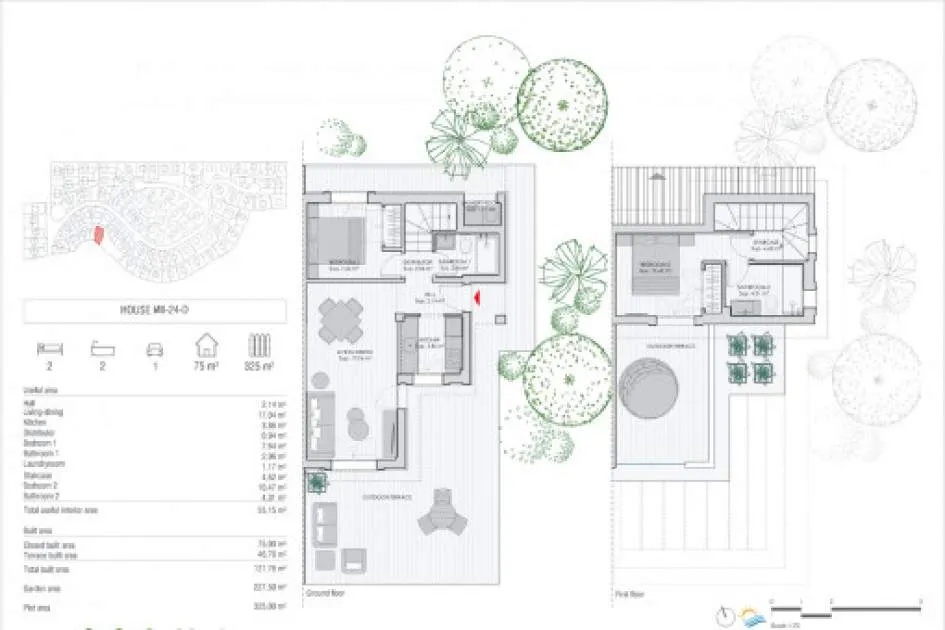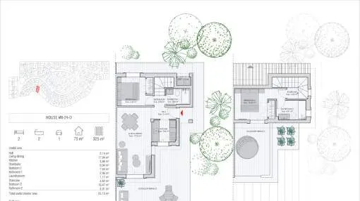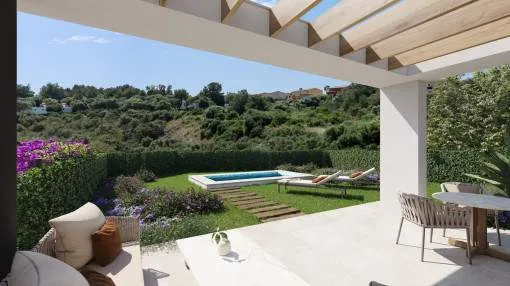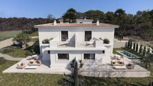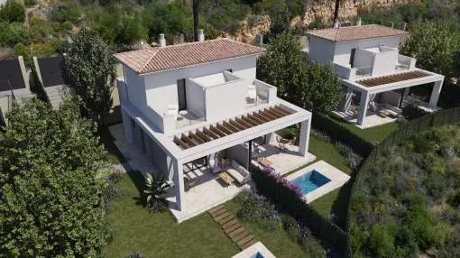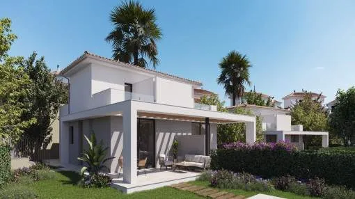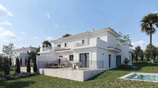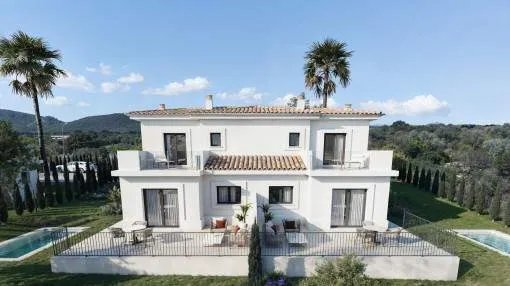 Details: This exclusive new-build project presents itself as an exceptional residential complex with a total of 159 stylish semi-detached houses and detached villas, embedded in a spacious 62,000 sqm site. The ensemble is complemented by an elegant social club, which rounds off the communal yet sophisticated residential concept. Situated in an incomparably beautiful landscape, the villas are characterized by an architectural concept that focuses on the harmonious combination of indoor and outdoor areas. Generous window fronts and well thought-out floor plans allow the Mediterranean light, nature and the relaxed island lifestyle to flow seamlessly into the living spaces. Each villa has a private, undeveloped plot, a spacious terrace, an outdoor parking space and the option to install a pergola and private pools to enjoy the idyllic surroundings and the unique climate of Mallorca to the full. With 2, 3 or 4 bedrooms and different floor plans with a living space of up to 150 sqm, these properties are ideal for families, couples, lovers of independent living, as a high-quality vacation home or as a versatile home that is perfect for remote work. The villas are equipped with everything you need for comfortable and contemporary living. High-quality kitchens with wall and base units offer generous storage space and are equipped with modern electrical appliances, including an extractor hood, induction hob, oven and dishwasher. The hot and cold installation ensures a pleasant indoor climate and maximum well-being all year round. A shuttle service takes you to the nearby bay of Cala Romantica in no time at all. Further units of this project: referenceconstructed areabedroomsfloorprice122632112 m²20€ 399,000.- 122632A118 m²20€ 408,000.- 122632B120 m²20€ 421,000.- 122632C192 m²30€ 674,000.- 122632D238 m²40€ 849,000.- 122632E154 m²30€ 503,000.- 122632F241 m²40€ 754,000.- 122632G155 m²30€ 547,000.- Returns from holiday lettings: For initial orientation you can use the “Porta Holiday Returns Calculator” without obligation to calculate your potential returns from holiday letting. NB: Due to the current legal situation it is possible that in certain municipalities renting restrictions may apply, or new touristic licences may not be granted. Your Porta Mallorquina real estate consultant will be pleased to advise you whether the property you have chosen is affected. Go to Returns Calculator. Location & surrounding area: The bay and the village Cala Mandía are situated on the east coast of Mallorca, just below Porto Cristo and belongs to the municipality of Manacor.