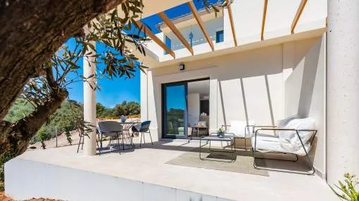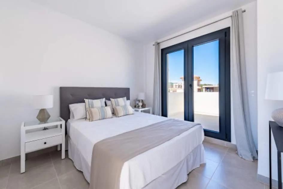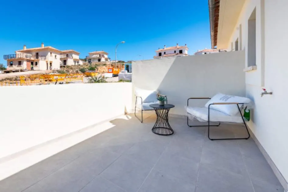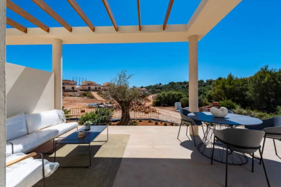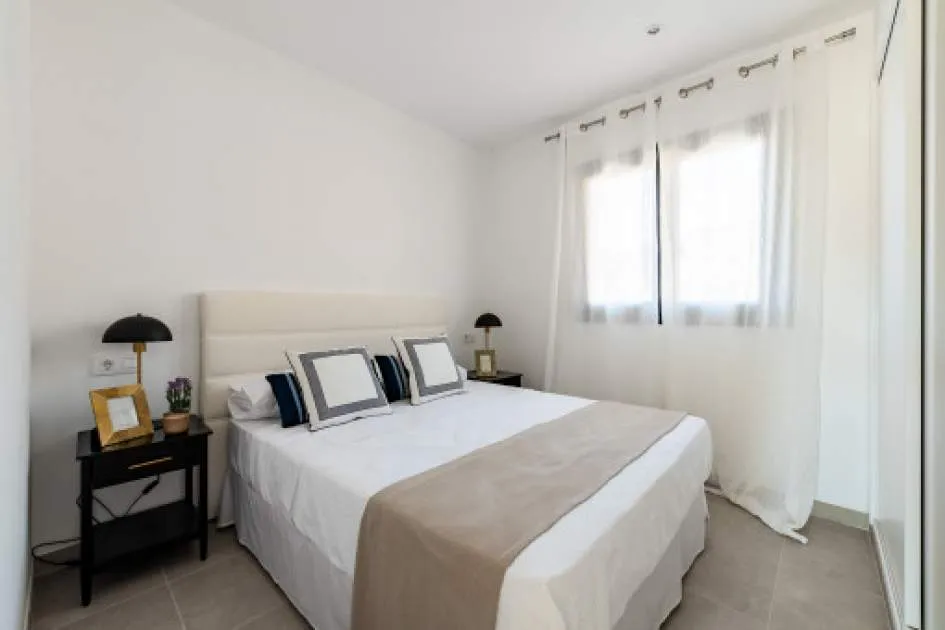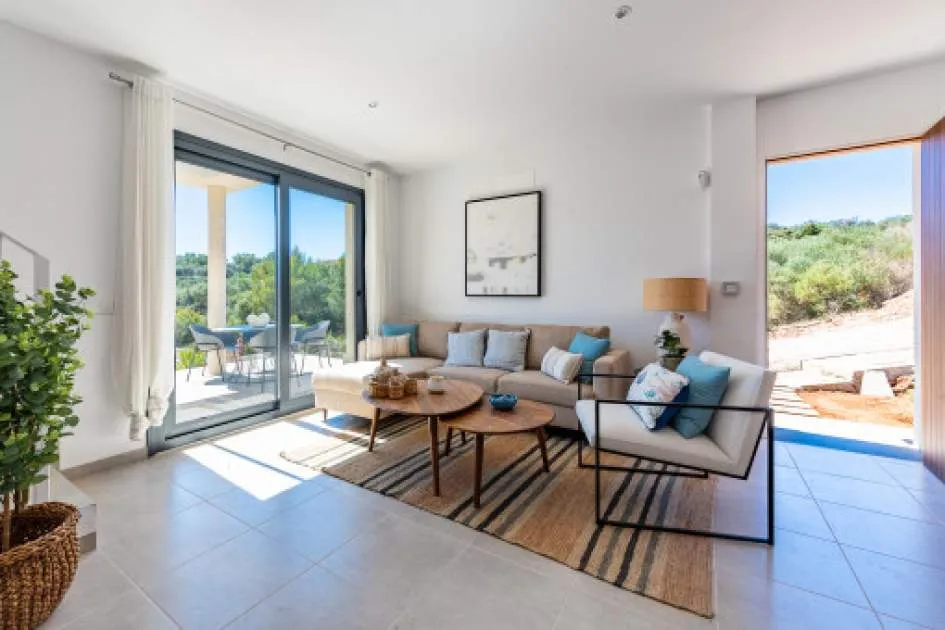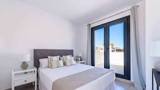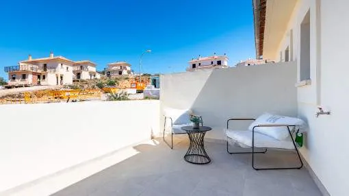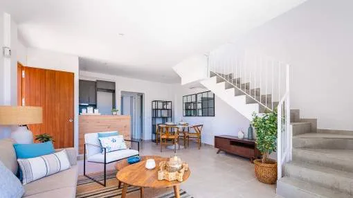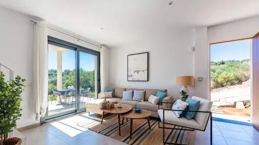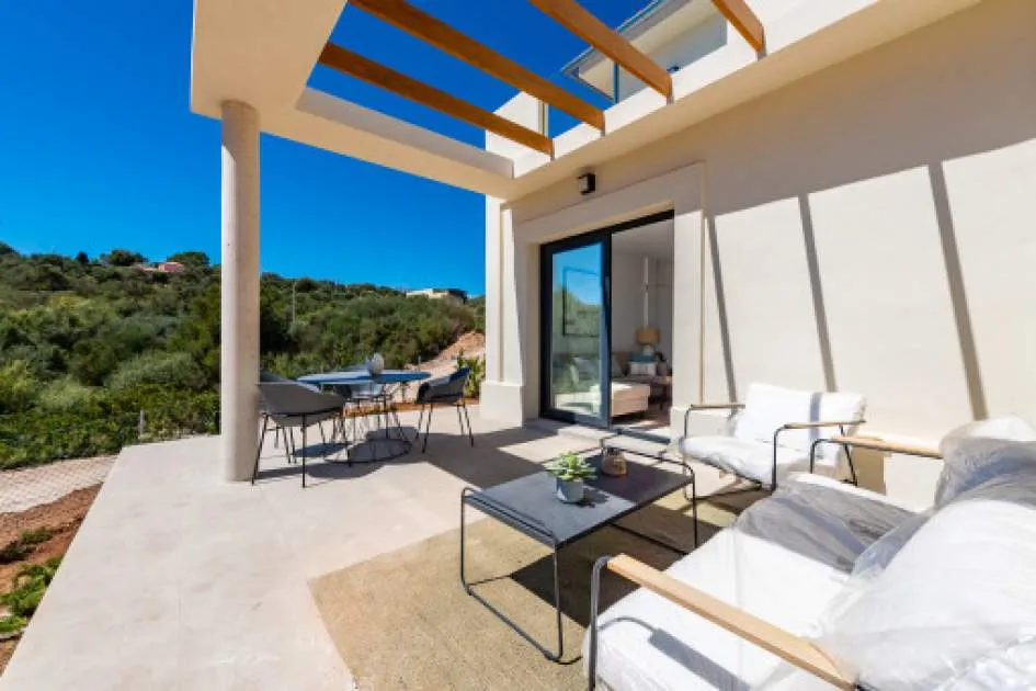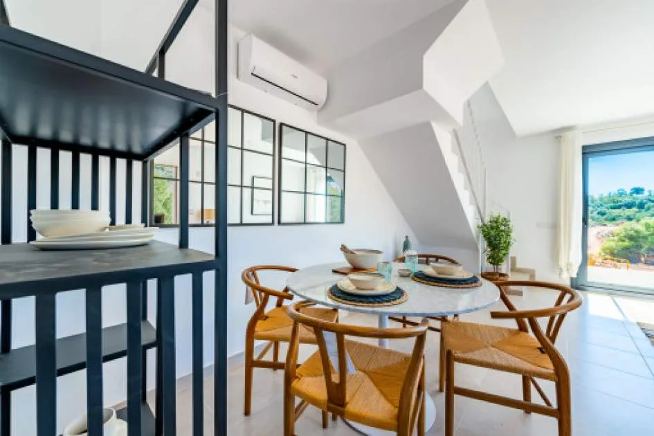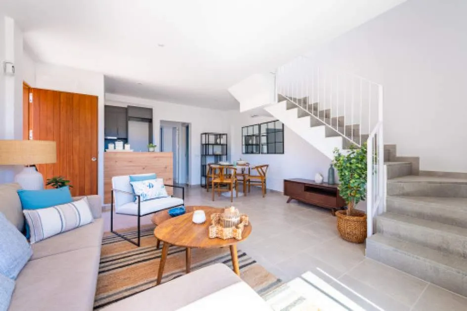 Details: This modern semi-detached house for first occupancy is located within a spacious, sophisticated residence where you can enjoy shared leisure facilities and services. There is a shuttle service to the nearby beautiful beach of Cala Romantica, various pool areas, wellness areas with sauna, gym or cinema and a small bar. Under the motto "Everything can, nothing must", there will be something for all individual needs to make every stay here a highlight for its residents. The property itself has its own plot of around 220 square meters. The constructed area of around 112 sqm is spread over 2 floors. The first floor is accessed via a partially covered terrace. The large open-plan living area with dining area and fully equipped fitted kitchen welcomes you there. Adjacent is a bedroom with built-in wardrobe and bathroom. A separate small laundry room provides further convenience. From the living area, a staircase leads to the second floor with the second bedroom, also with a bathroom and fully fitted wardrobe. Two small sun terraces, where you have privacy, ensure wonderful relaxation. Equipment: - Air conditioning with hot/cold function - Option: Underfloor heating in both bathrooms and backlit mirrors - Pre-installation of home automation; optional control of lighting and air conditioning - Fully furnished and equipped kitchen with Bosch/Siemens appliances; optional Neff appliances - Exterior windows/doors made of PVC or aluminum (thermal break) incl. double glazing with air chamber - Sliding or folding sash opening systems Further units of this project: referenceconstructed areabedroomsfloorprice120109112 m²20€ 399,000.- 120109A112 m²20€ 399,000.- 120109B112 m²20€ 399,000.- 120109D112 m²20€ 399,000.- 120109G120 m²20€ 399,000.- Returns from holiday lettings: For initial orientation you can use the “Porta Holiday Returns Calculator” without obligation to calculate your potential returns from holiday letting. NB: Due to the current legal situation it is possible that in certain municipalities renting restrictions may apply, or new touristic licences may not be granted. Your Porta Mallorquina real estate consultant will be pleased to advise you whether the property you have chosen is affected. Go to Returns Calculator. Location & surrounding area: Cala Romantica A bay that lives up to its name. Idyllically situated with a brilliant white sandy beach, turquoise shimmering crystal clear water and embedded in forested rocks. Pictures that almost reflect Caribbean flair. The beautiful town with many plant-lined streets has small manageable resorts and development of private villas. A few restaurants and bars hold Mediterranean delicacies and refreshments for their guests. The location is ideal between the charming small port towns of Porto Cristo and Portocolom. Typical Mallorcan places that invite you to store with their small stores or eat in the many cozy restaurants on the harbor promenades.