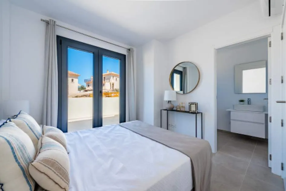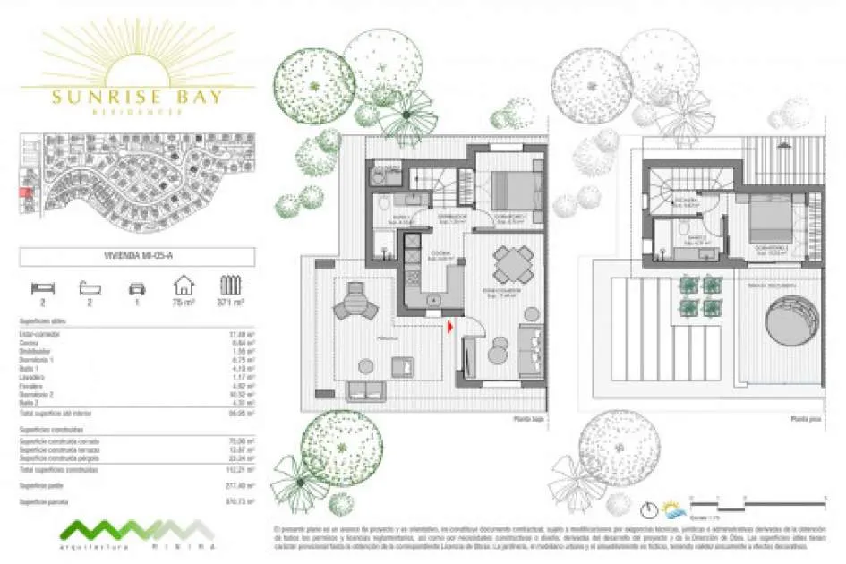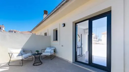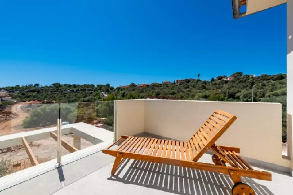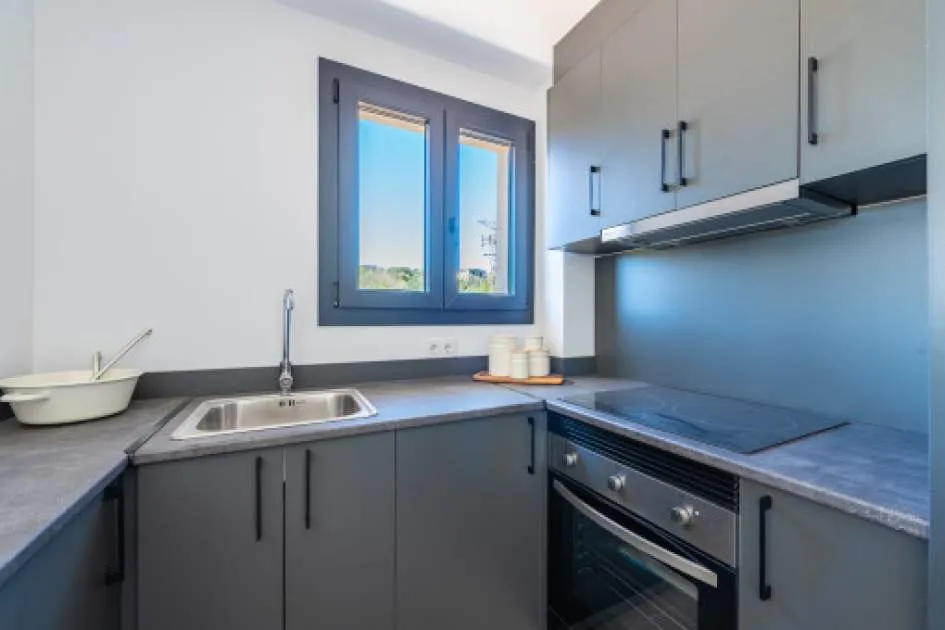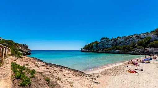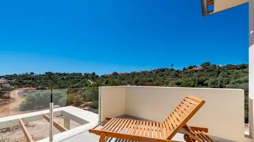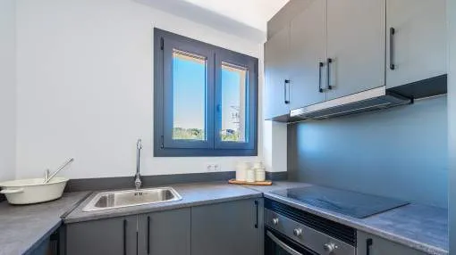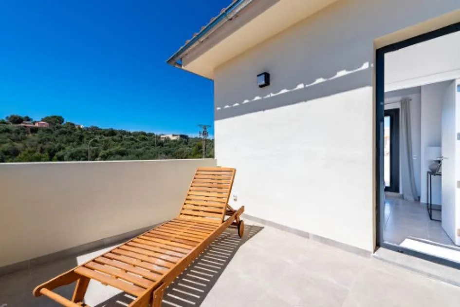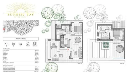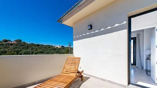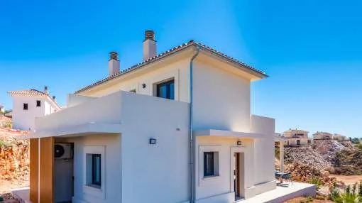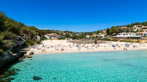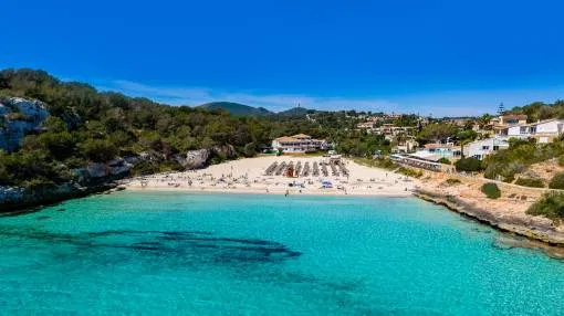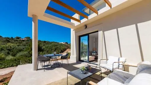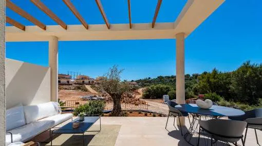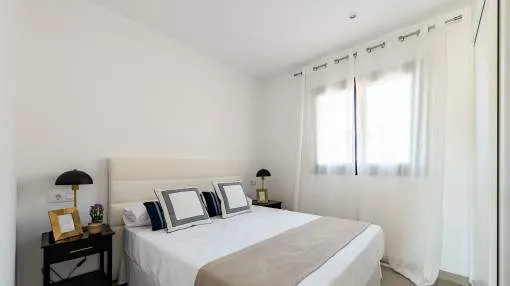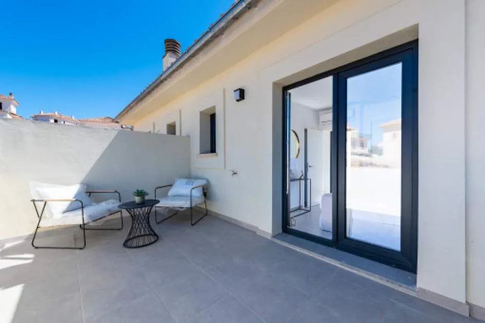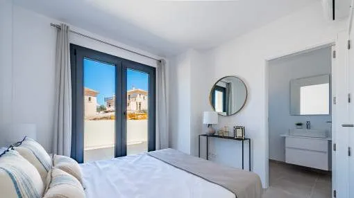 Details: This modern semi-detached house for first occupancy is located within a spacious, sophisticated residence where you can enjoy shared leisure facilities and services. There is a shuttle service to the nearby beautiful beach of Cala Romantica, various pool areas, wellness areas with sauna, gym or cinema and a small bar. Under the motto "Everything can, nothing must", there will be something for all individual needs to make every stay here a highlight for its residents. The property itself has its own plot of around 220 square meters. The constructed area of around 112 sqm is spread over 2 floors. The first floor is accessed via a partially covered terrace. The large open-plan living area with dining area and fully equipped fitted kitchen welcomes you there. Adjacent is a bedroom with built-in wardrobe and bathroom. A separate small laundry room provides further convenience. From the living area, a staircase leads to the second floor with the second bedroom, also with a bathroom and fully fitted wardrobe. Two small sun terraces, where you have privacy, ensure wonderful relaxation. Equipment: - Air conditioning with hot/cold function - Option: Underfloor heating in both bathrooms and backlit mirrors - Pre-installation of home automation; optional control of lighting and air conditioning - Fully furnished and equipped kitchen with Bosch/Siemens appliances; optional Neff appliances - Exterior windows/doors made of PVC or aluminum (thermal break) incl. double glazing with air chamber - Sliding or folding sash opening systems Further units of this project: referenceconstructed areabedroomsfloorprice120109112 m²20€ 399,000.- 120109A112 m²20€ 399,000.- 120109B112 m²20€ 399,000.- 120109D112 m²20€ 399,000.- 120109G120 m²20€ 399,000.- Returns from holiday lettings: For initial orientation you can use the “Porta Holiday Returns Calculator” without obligation to calculate your potential returns from holiday letting. NB: Due to the current legal situation it is possible that in certain municipalities renting restrictions may apply, or new touristic licences may not be granted. Your Porta Mallorquina real estate consultant will be pleased to advise you whether the property you have chosen is affected. Go to Returns Calculator. Location & surrounding area: Cala Romantica A bay that lives up to its name. Idyllically situated with a brilliant white sandy beach, turquoise shimmering crystal clear water and embedded in forested rocks. Pictures that almost reflect Caribbean flair. The beautiful town with many plant-lined streets has small manageable resorts and development of private villas. A few restaurants and bars hold Mediterranean delicacies and refreshments for their guests. The location is ideal between the charming small port towns of Porto Cristo and Portocolom. Typical Mallorcan places that invite you to store with their small stores or eat in the many cozy restaurants on the harbor promenades.