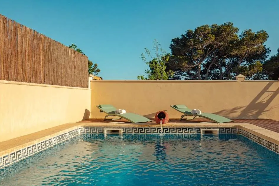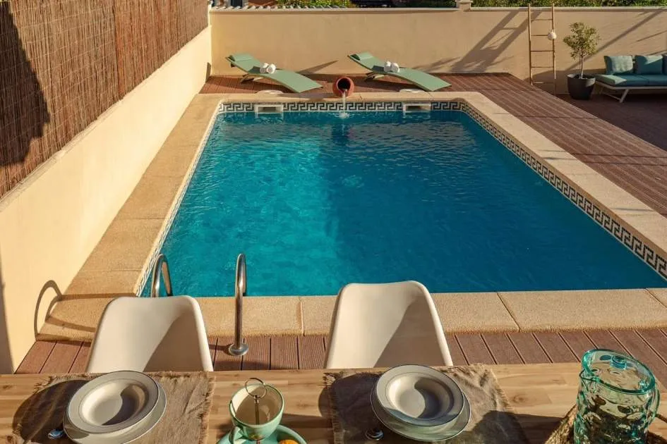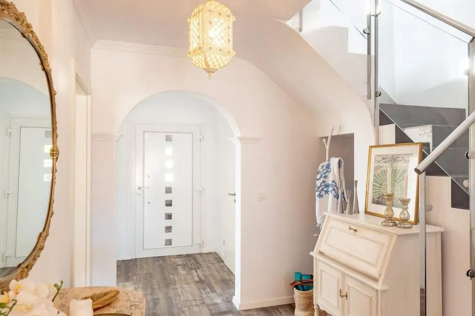 The spacious living and dining area opens seamlessly onto an elegant teak terrace that leads directly to the outdoor area with pool. Here, a large terrace invites you to relax. Upstairs, on the other hand, two stylish double bedrooms and a fully equipped bathroom await, as both bedrooms share a bathroom. Two balconies offer a peaceful retreat with uninterrupted views of the sea and will make the hearts of nature lovers beat faster. The entire house has been extensively renovated and offers modern living comfort: high-quality, double-glazed PVC windows, heating and air conditioning in all rooms ensure cosy warmth in winter and pleasant coolness in summer.