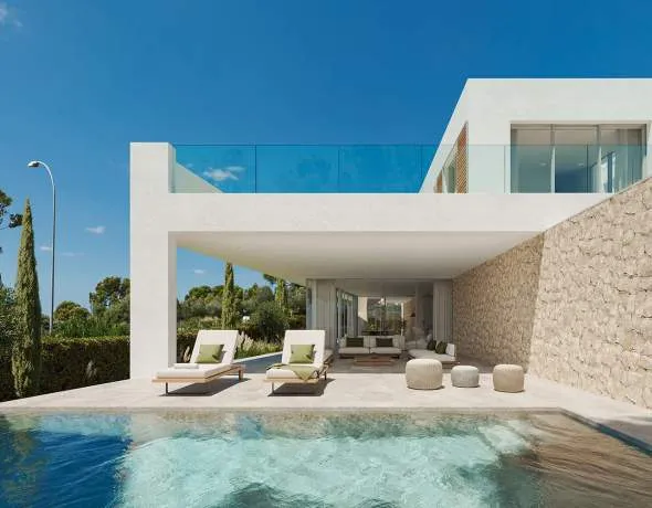 The villa is part of an exclusive ensemble of luxurious residences that combines sophisticated living with contemporary architecture at the highest level. During its construction, particular emphasis was placed on the use of exquisite materials and a stylish, high-quality finish. Harmoniously balanced proportions, elegant natural stone accents, generous ceiling heights, as well as floor-to-ceiling doors and window fronts create a bright, open atmosphere and underline the modern concept. The southwest orientation ensures ideal lighting conditions throughout the day and beautiful sunsets.