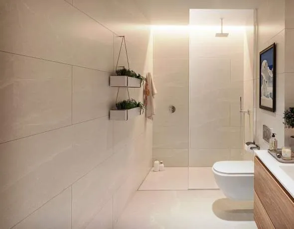 Large format porcelain tiles were selected for all rooms in the apartments. The same tiles are laid in the non-slip version outside.