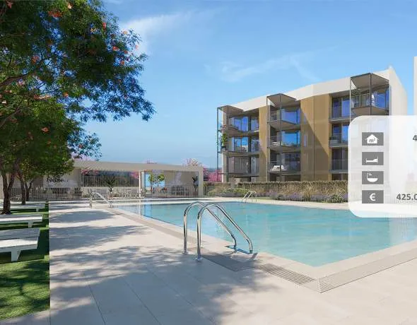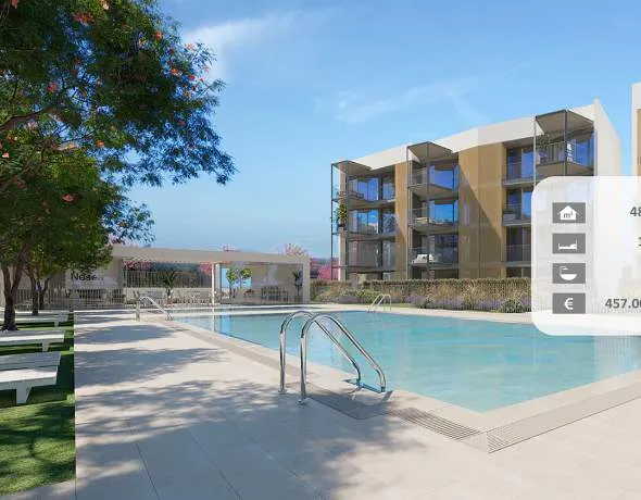 This modern residential complex with four energy-efficient buildings and a total of 36 properties is under construction in a sought-after seaside resort in the southwest of the island and only 15 kilometres from Palma. The region offers a perfect infrastructure and has a high recreational value. Beautiful beaches, exclusive marinas, golf courses, shopping facilities and sports facilities are within a few minutes by car. The complex, which is scheduled for completion first trimeter 2026, is located only 300 metres from the lovely sandy beach of the village and boasts beautiful communal areas with swimming pool, sun terrace, children’s pool, function room and gym plus underground parking and bicycle storage. The bright apartments of best quality and with living areas between 48 m² and 82 m² feature 1-3 bedrooms, 2 bathrooms (one en suite), a dressing room, a spacious living/dining room, a fully equipped kitchen with utility room and a large terrace. The ground floor apartments have small private garden.