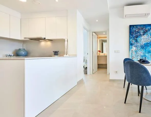 These modern Ibizan white apartments have very high quality furnishings. The distribution in the apartments inspire with plenty of space in 2 bedrooms with bathrooms, living room and large terraces or, on the ground floor apartments, verandas with own garden area. Spacious gardens surround the area and 2 large community pools invite you to enjoy Mediterranean life. A parking space also belongs to each apartment.