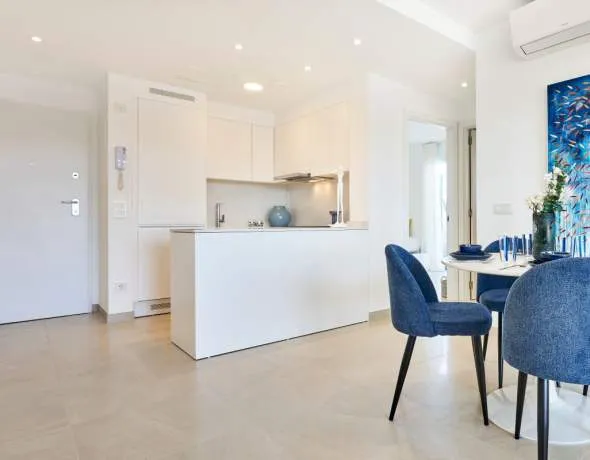 These modern Ibizan white apartments have very high quality furnishings. The distribution in the apartments inspire with plenty of space in 2 bedrooms with bathrooms, living room and large terraces or, on the ground floor apartments, verandas with own garden area. Spacious gardens surround the area and 2 large community pools invite you to enjoy Mediterranean life. A parking space also belongs to each apartment. Cala d'Or is located in the southeast of Mallorca and is very well known for its marina along Cala Llonga. Beautiful bays and excellent restaurants offer you the finest lifestyle. You can also go hiking or swimming in the southwest of Cala d'Or and visit the famous nature park of Mondragó - home to a variety of birds such as cormorants and ospreys. Our team at the Santanyi office will be happy to provide you with further information.