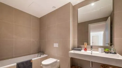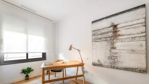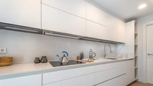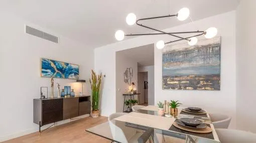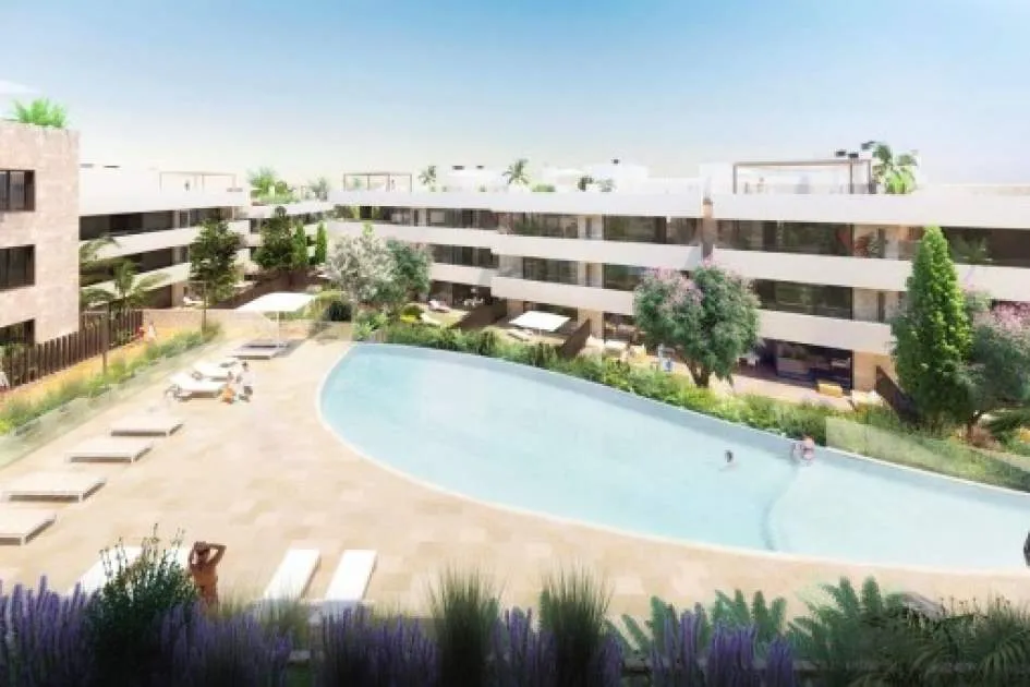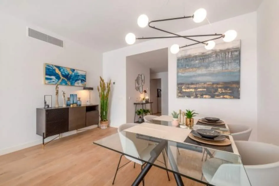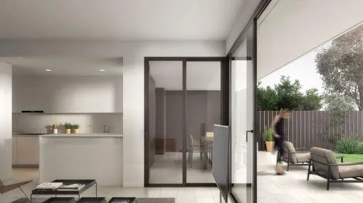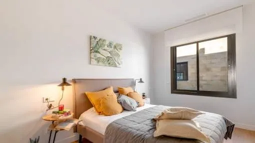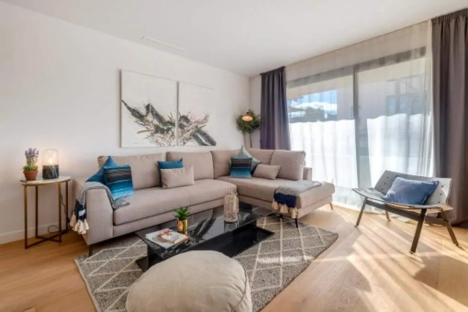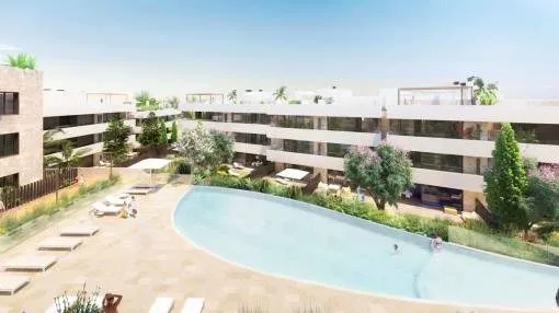 Details: This quiet new development on Son Quint golf course, in Son Rapinya, is surrounded by 3 golf courses and less than 15 minutes from the centre and Palma airport. In the complex there are apartments with 2, 3 or 4 bedrooms, on the ground floor with garden, as a penthouse with roof terrace and on the first floor with balcony. Highlights are the extravagant and spacious communal pool area with spa and wellness area and the various individualization options through selectable equipment lines. The bright ground floor apartment has 143 sqm of interior construction space and 157 sqm of exterior space, an open-plan living and dining area with access to the terrace, a kitchen fully equipped with Siemens appliances, 4 bedrooms and 2 bathrooms, one of which is en suite. An underground parking space and a cellar room can be acquired for each apartment. Further details: Underfloor heating in all rooms, elevator, real wood parquet flooring, integrated air conditioning, video intercom and surveillance, fiber optic preparation, communal bike room, optional smarthome control and sound system, and charging station for electric cars. Ready for occupancy since: Q2 2021 Location & surrounding area: Son Rapinya is a growing district in Palma de Mallorca and is characterised by both its proximity to the town, and by its tranquillity and green surroundings. This makes it the ideal residential area for those seeking an urban location together with a natural environment. Its proximity to the centre of Palma, international schools, and 3 golf courses (Son Muntaner, Son Quint and Son Vida) make the area very attractive for families and keen golfers. There are also many other facilities close by including clinics, supermarkets, service stations, tennis clubs, fitness studios, restaurants and diverse other amenities. Palma's beautiful old town is only 10 minutes away, and the airport can be reached within 15 minutes by car.