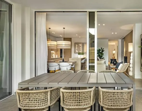 The bright, sun-filled interiors impress with generous proportions and a thoughtful layout. Floor-to-ceiling windows create a seamless connection to the outdoors, leading to a 68 m² private garden with a heated plunge pool. In addition, the apartment features a 23 m² terrace at the entrance, providing an inviting outdoor space before stepping inside. High ceilings and clean architectural lines enhance the airy and elegant atmosphere.