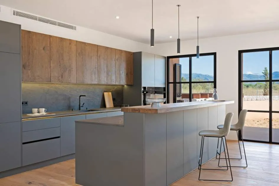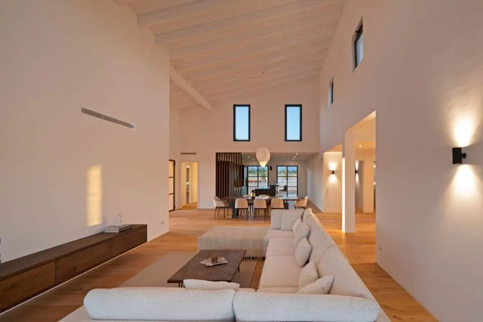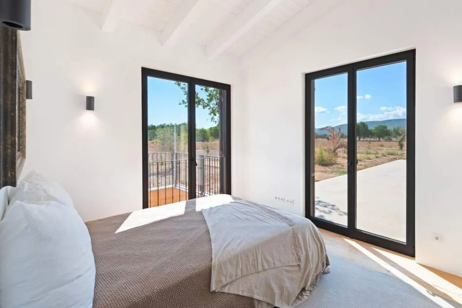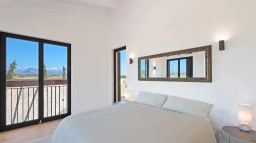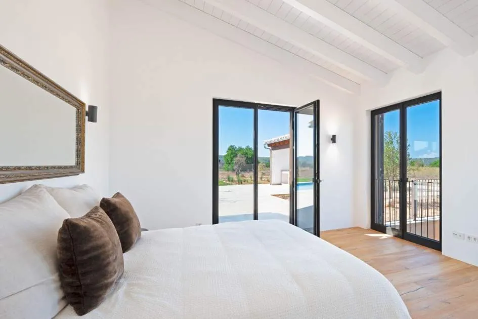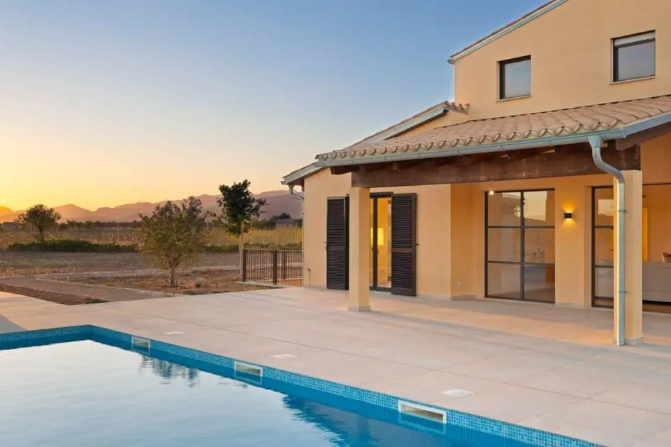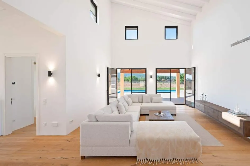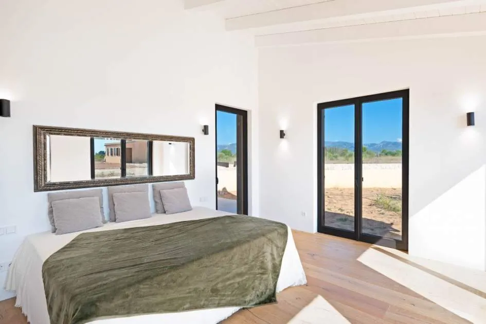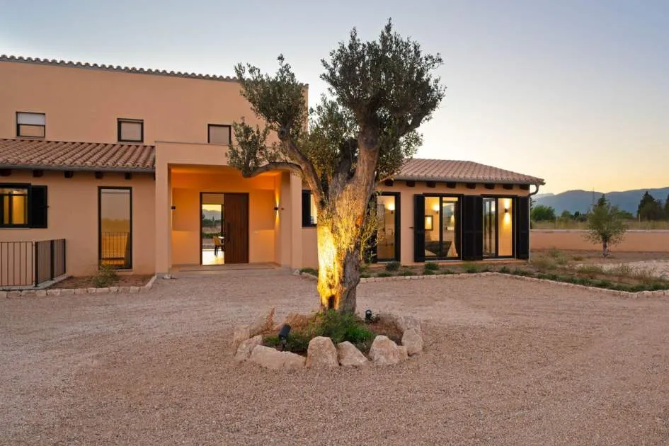 This contemporary Mediterranean property is nestled in the tranquil Mallorcan countryside at the foot of the UNESCO World Heritage-listed Tramuntana mountain range. Surrounded by the idyllic vineyard region of Santa Maria and the neighboring town of Binissalem, it has been thoughtfully designed to harmoniously combine rustic charm with modern luxury. The residence offers generous and comfortable living, featuring an open-plan living area and a fully equipped designer kitchen with double fridge, freezer, oven, and induction stove. Four en-suite bedrooms provide privacy and elegance, while the lower level holds potential for a bodega or the addition of a fitness, spa, and wellness area. A saltwater pool with inviting terraces creates an oasis of relaxation, ensuring both comfort and complete privacy. The property is equipped with a KNX-Home System by GIRA as well as an integrated alarm system, providing convenience and security. Parking for up to four vehicles is also available. The finca is sold fully furnished with pieces from STORK, complemented by numerous decorative items. A license for a well has already been applied for and should arrive by the end of the year. Located just twelve minutes from Palma, the vibrant village of Santa Maria is within easy reach, known for its lively weekly market and abundance of fresh local produce.