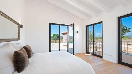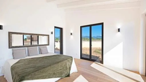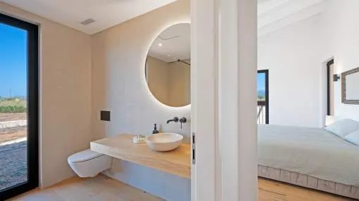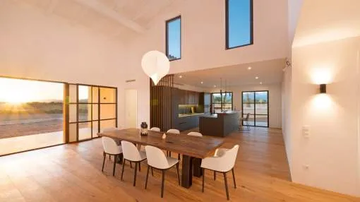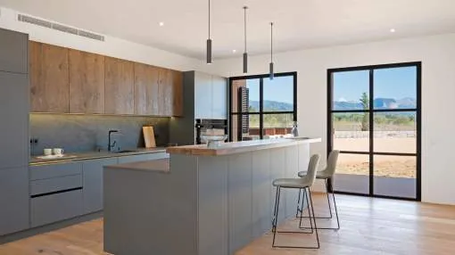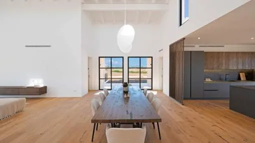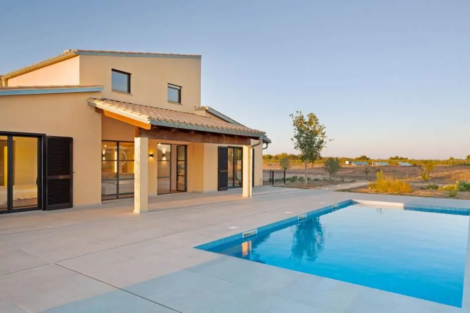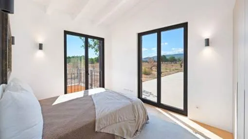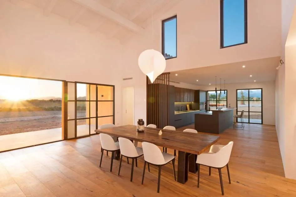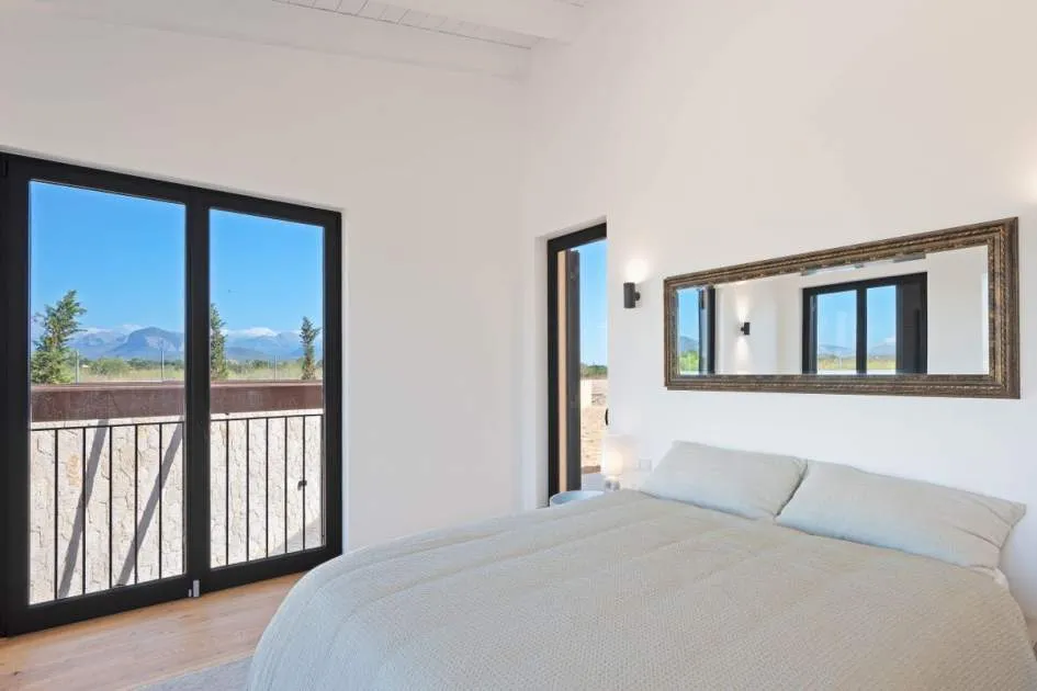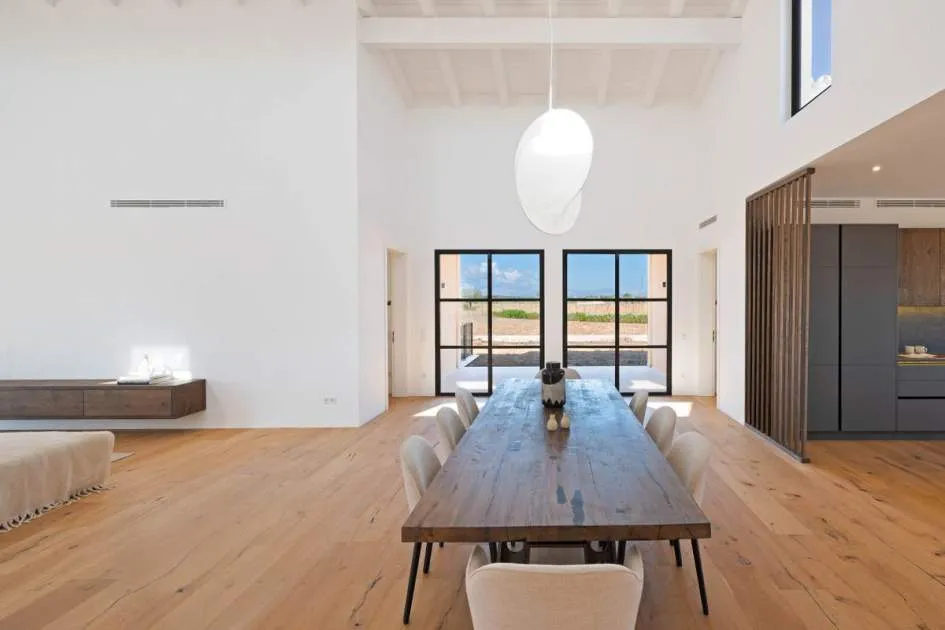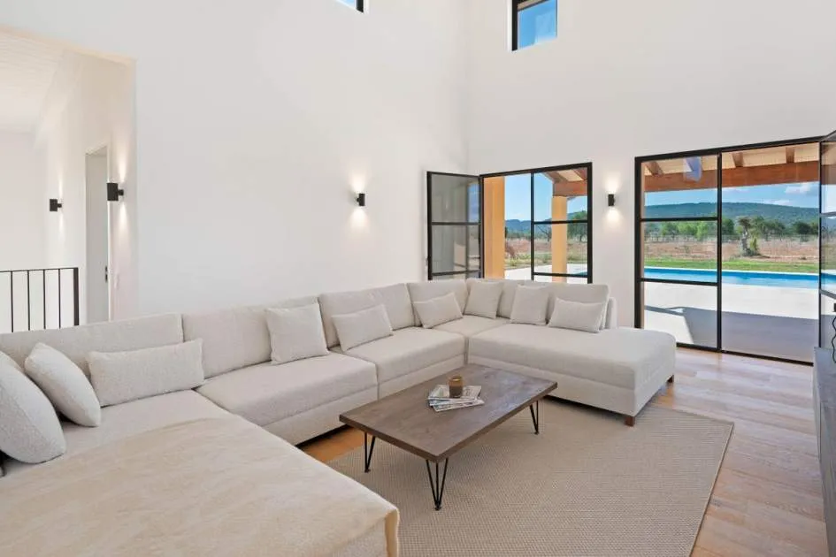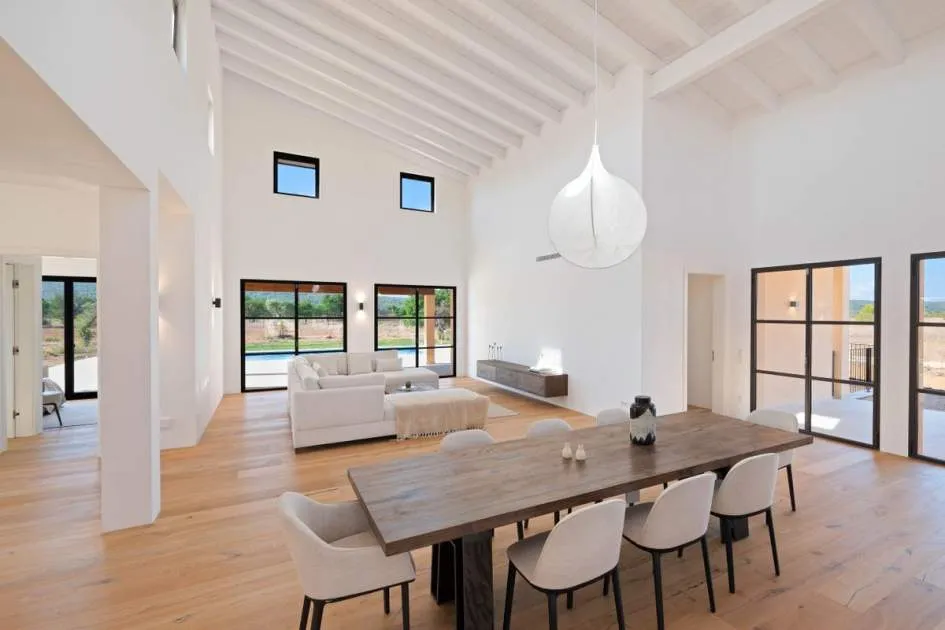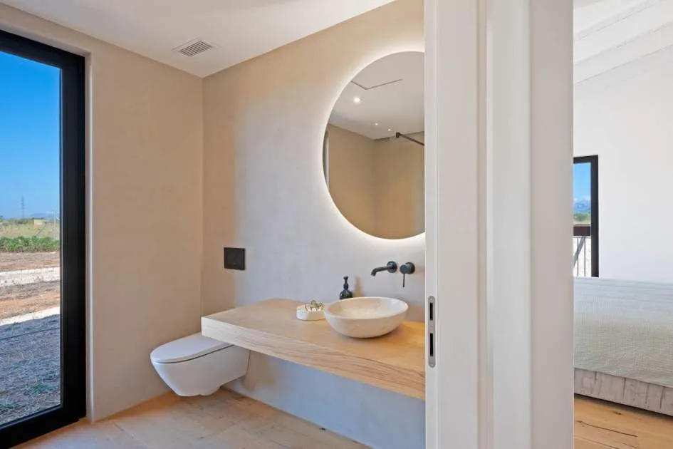 This contemporary Mediterranean property is nestled in the tranquil Mallorcan countryside at the foot of the UNESCO World Heritage-listed Tramuntana mountain range. Surrounded by the idyllic vineyard region of Santa Maria and the neighboring town of Binissalem, it has been thoughtfully designed to harmoniously combine rustic charm with modern luxury. The residence offers generous and comfortable living, featuring an open-plan living area and a fully equipped designer kitchen with double fridge, freezer, oven, and induction stove. Four en-suite bedrooms provide privacy and elegance, while the lower level holds potential for a bodega or the addition of a fitness, spa, and wellness area. A saltwater pool with inviting terraces creates an oasis of relaxation, ensuring both comfort and complete privacy. The property is equipped with a KNX-Home System by GIRA as well as an integrated alarm system, providing convenience and security. Parking for up to four vehicles is also available. The finca is sold fully furnished with pieces from STORK, complemented by numerous decorative items. A license for a well has already been applied for and should arrive by the end of the year. Located just twelve minutes from Palma, the vibrant village of Santa Maria is within easy reach, known for its lively weekly market and abundance of fresh local produce.