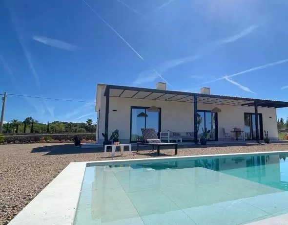 We present this beautiful newly built rural property in Muro, with easy access from the Muro–Can Picafort road and just a few minutes' drive from all the amenities of the village. This property perfectly combines a peaceful setting with modern comfort. The 150m² house, set on a 16,000m² plot, has been carefully designed with spacious, bright and open spaces and contemporary finishes that create a warm and welcoming atmosphere. The heating is underfloor and the air conditioning is ducted (hot/cold), ensuring maximum comfort throughout the year. Upon entering the house, we find a completely open-plan space with large windows that frame the beautiful views of the garden and fill the house with natural light. This space is divided into a comfortable living room with television, a spacious dining room that connects to a modern, fully equipped kitchen with an island. The property has three large double bedrooms, all with en-suite bathrooms, as well as a guest toilet. Outside, there is a private swimming pool with a salt chlorination system and a covered terrace, ideal for relaxing and enjoying complete privacy. This property offers a unique opportunity to experience the tranquillity of rural life in Mallorca with all the comforts of a modern home. Contact First Mallorca today to arrange a viewing.