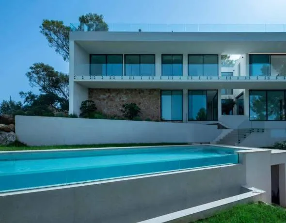 This exceptional newly built villa in Santa Ponsa, finalized in August 2025 and now move-in ready, offers breathtaking panoramic mountain views that feel like a living canvas. Nestled in the serene and prestigious area of Rotes Velles, it enjoys close proximity to the beach and is within walking distance to the vibrant center of Santa Ponsa. Perfectly north-facing for optimal summer comfort, the villa also features a sunny rooftop terrace. Crafted with high-end materials and meticulous attention to detail, it includes underfloor heating, an infinity pool, and a private lift providing access to all levels. Boasting 4 spacious en-suite bedrooms and a dedicated office space, the property overlooks a protected green zone, ensuring no future developments and complete privacy. A rare find in a prime location, this villa represents a truly unique opportunity to own a luxurious home of unparalleled quality.